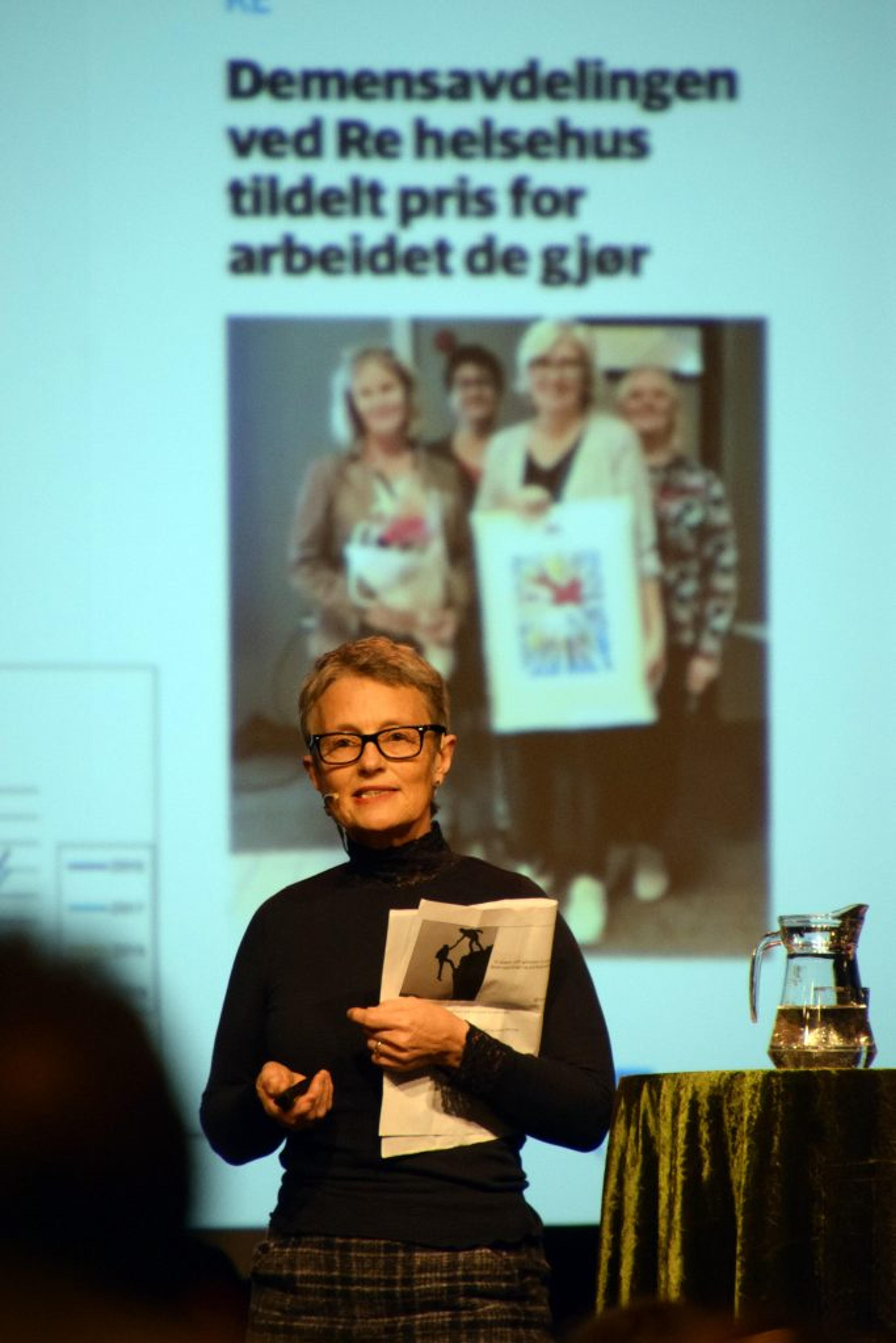 Tove Hovland viste fram flere plansjer, deriblant avisutklipp fra ReAvisa omGrønn omsorg på Dal gårdogdemenspris til Re helsehus.