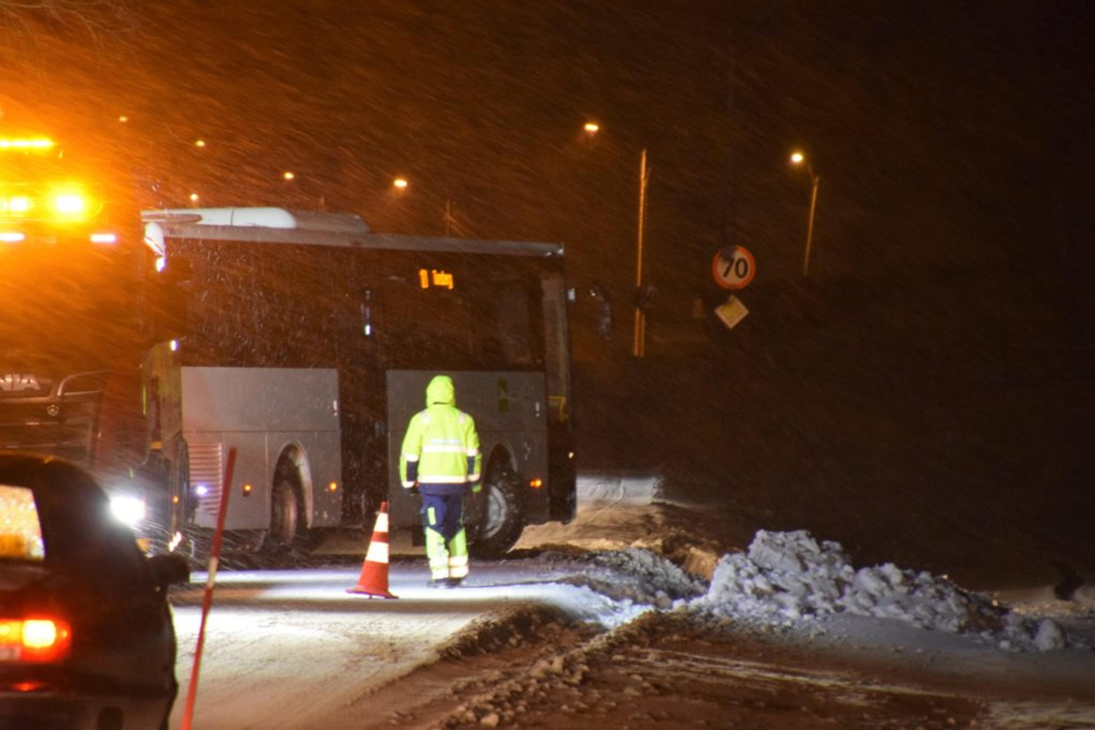 VELBERGA: Bussen som sperra Ramnesveien etter å ha kjørt i grøfta er her oppe på veien igjen. Foto: Stian Ormestad.