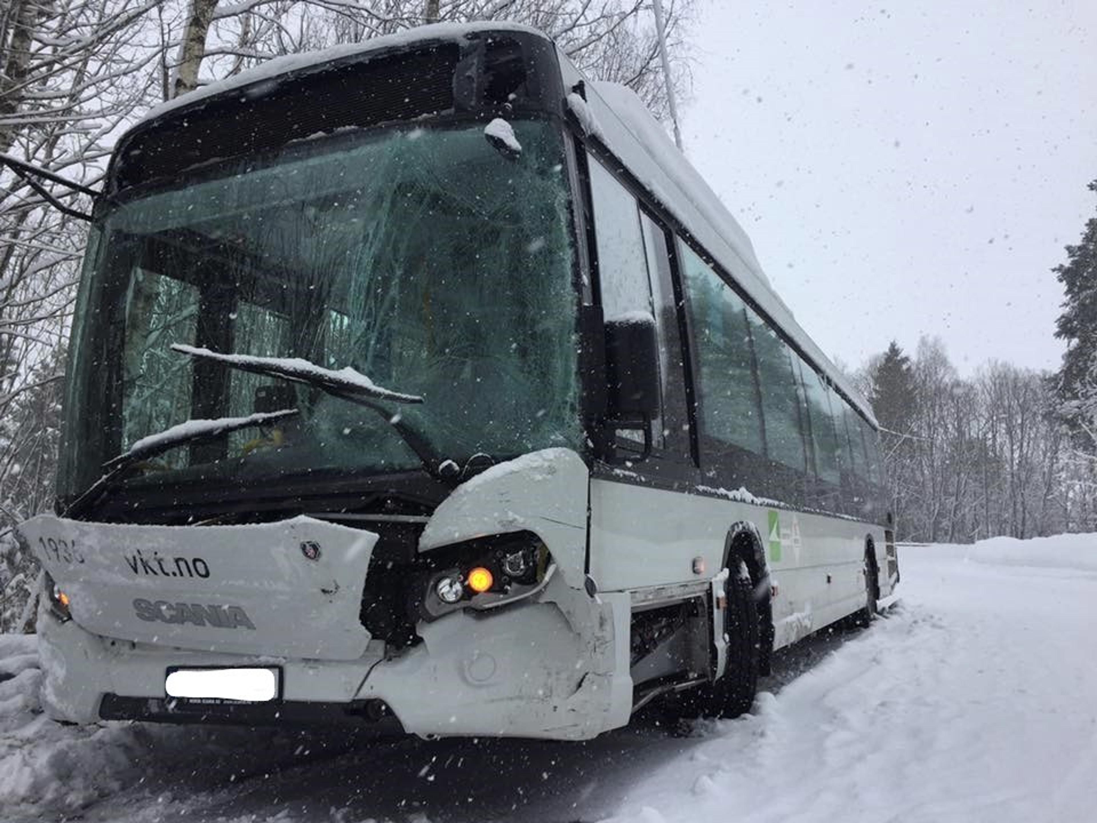 MATERIELLE SKADER: Denne bussen var ikke kjørbar etter kjedekollisjonen og står igjen i bakken – nesten tre timer etter ulykken. Foto: Stian Ormestad.