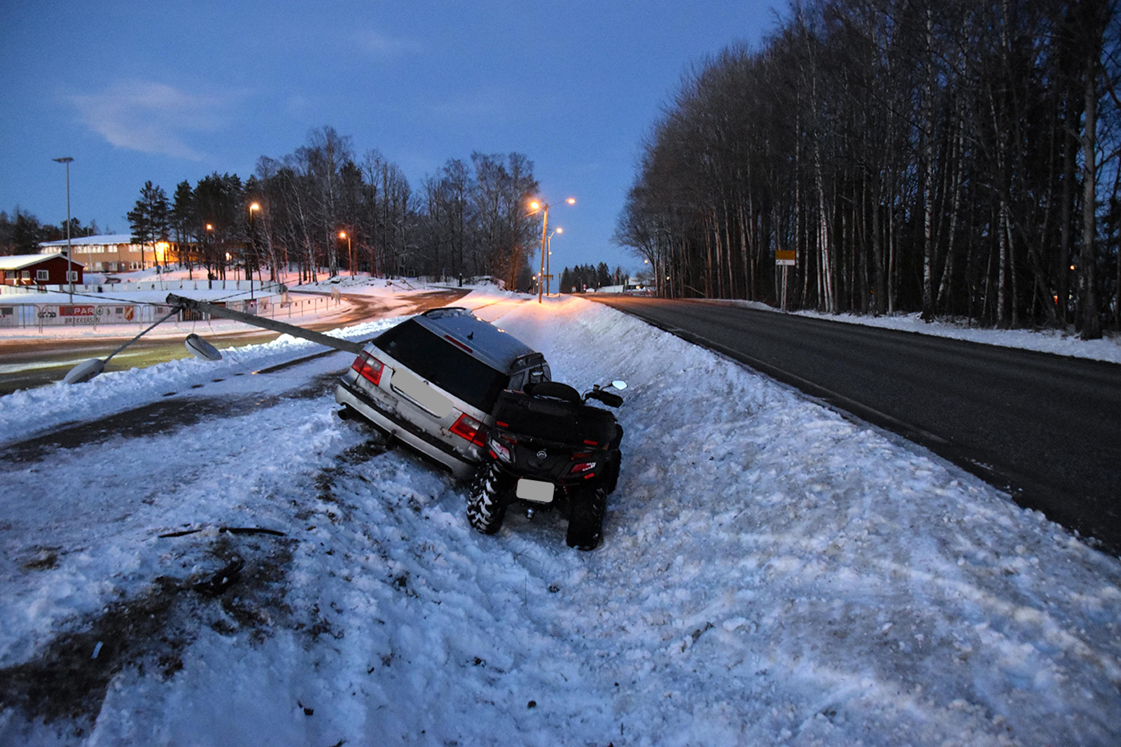 BOMSTOPP: Bilen har kjørt ned en lyktestolpe. Til alt hell har bilen så vidt vært borti ATV-en, som skulle svinge inn til Bibo. Foto: Stian Ormestad.