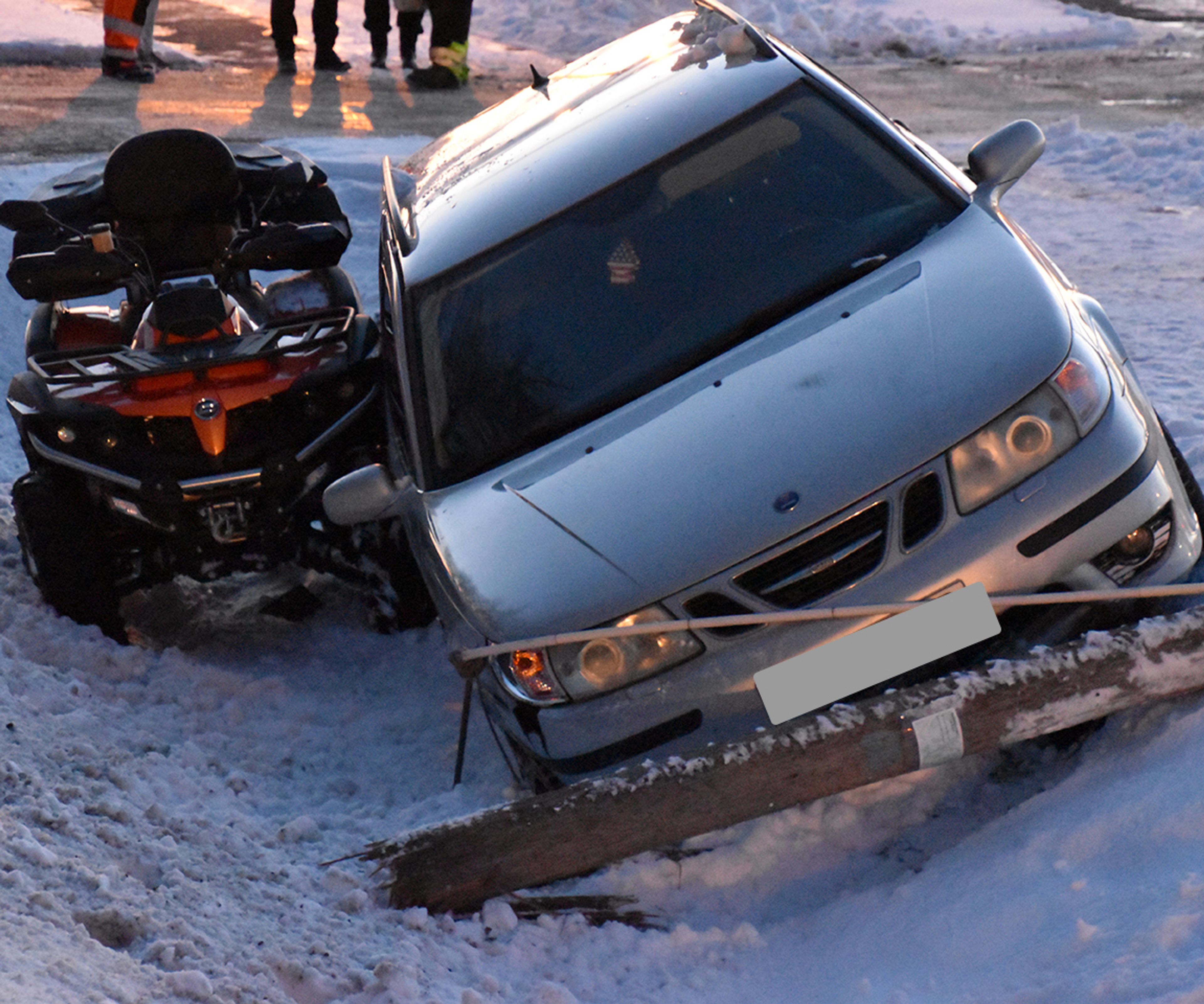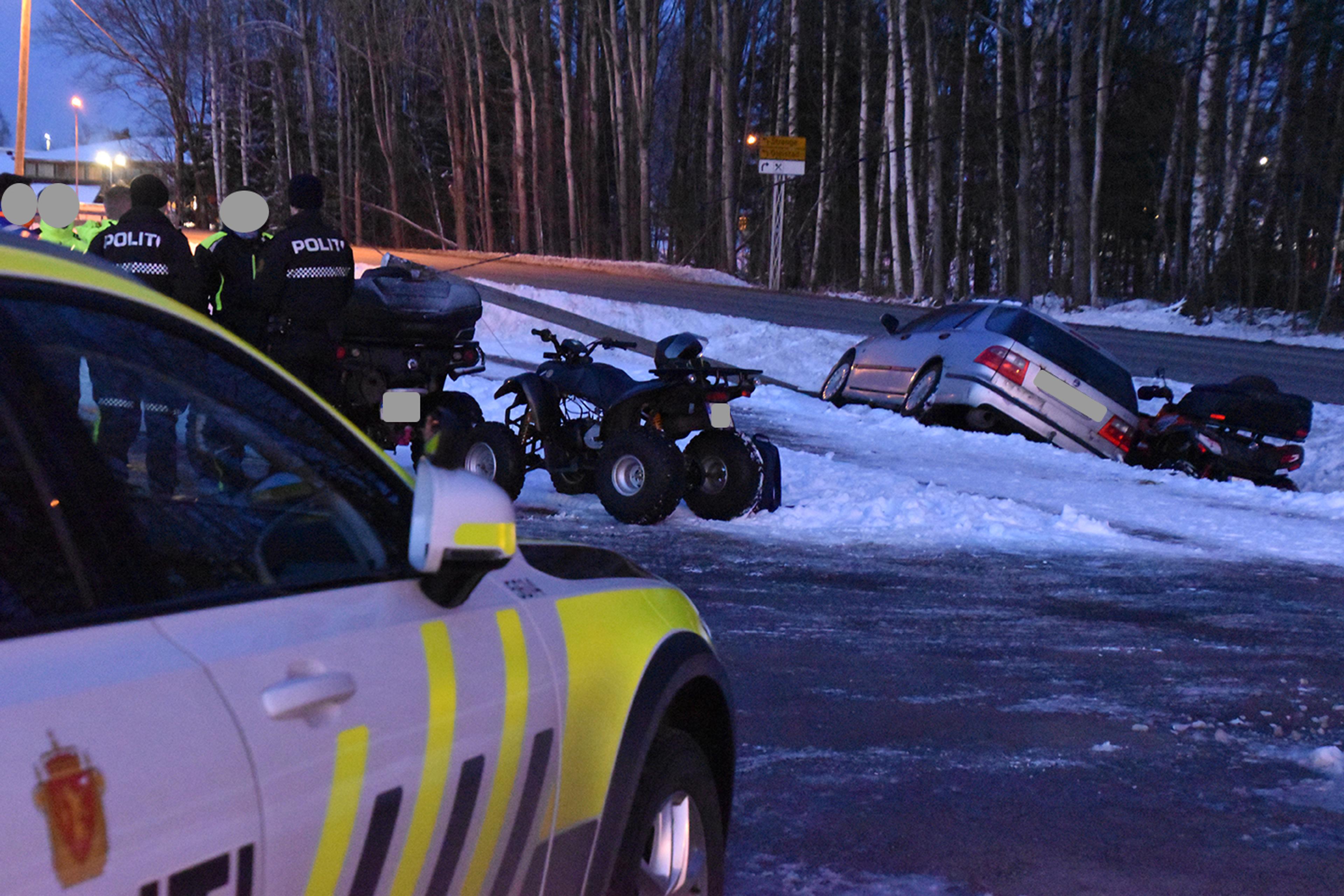 Folk på stedet forteller til ReAvisa om flaks i uflaks: Bilen skal så vidt ha unngått å kjøre ned ATV-en med en lokal unggutt på. Han er oppegående, frisk og rask.