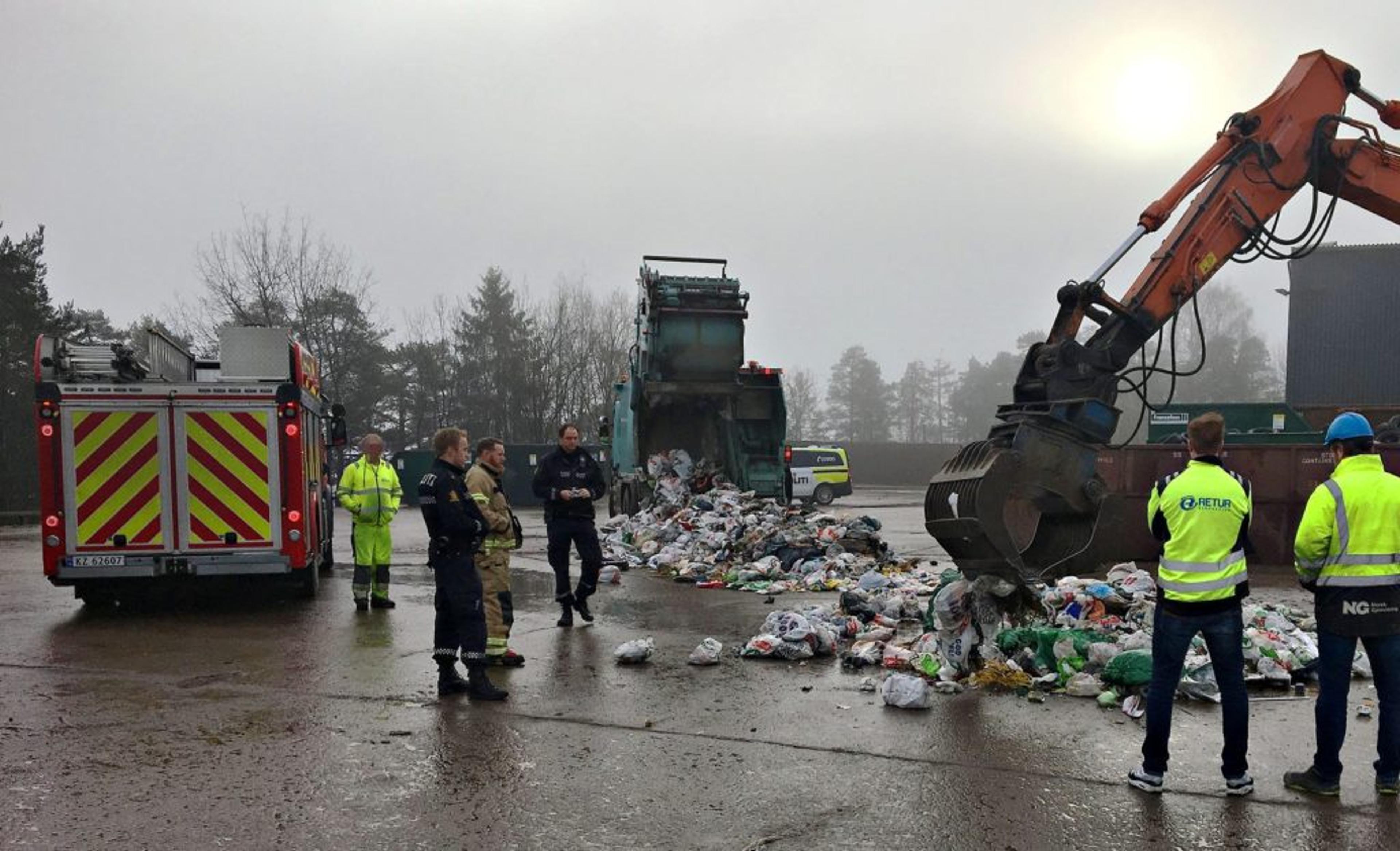 Løsningen er å kjøre søppelbilen til Taranrød og Rygg gjenvinningsstasjon, der planen er å tømme lasten og slokke brannen skikkelig.