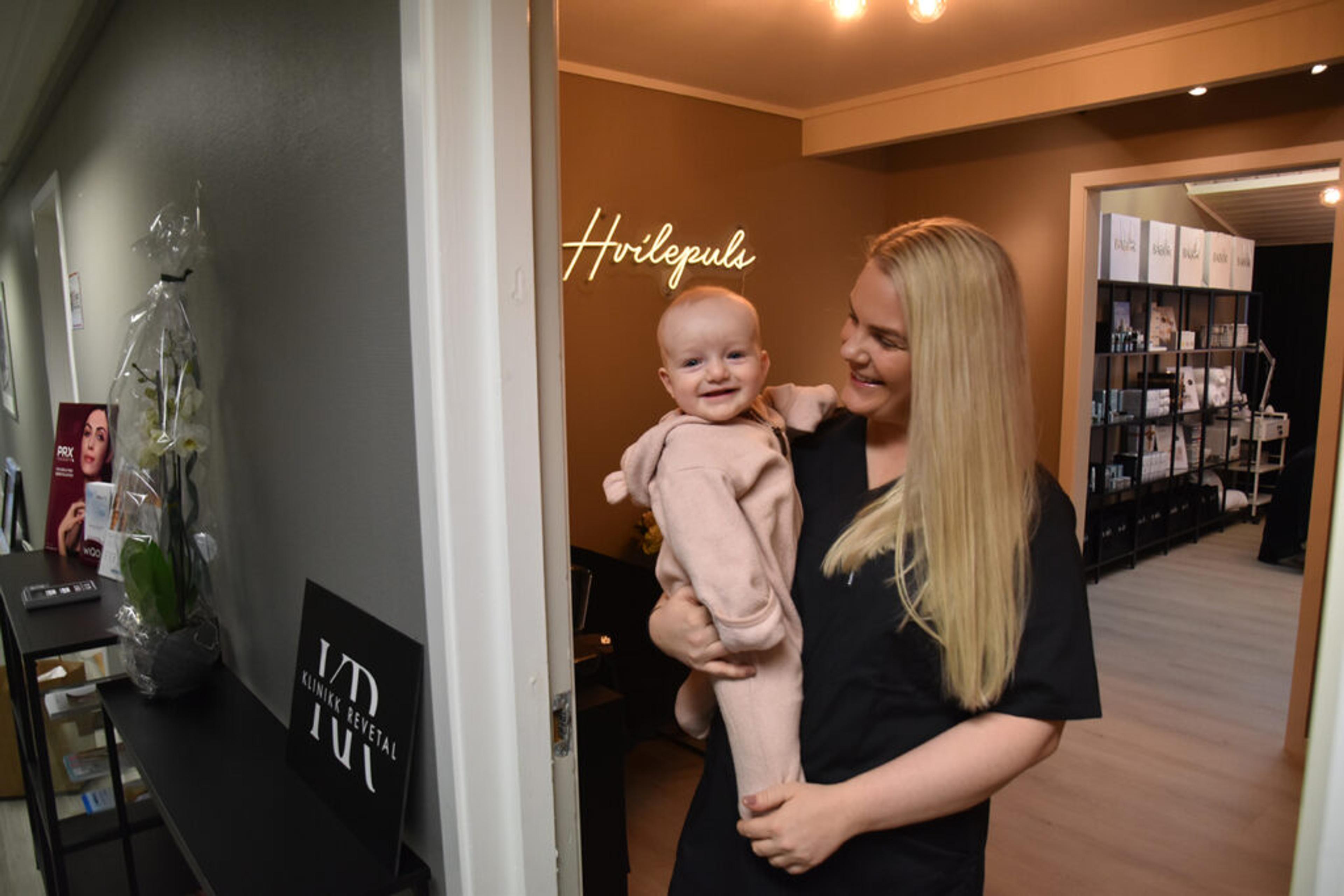 Med to barn på under 3 år må det bli sånn. Klinikk Revetal skal bygge seg opp kunde for kunde. Christel er i delvis mammaperm med Frøya på åtte måneder.
