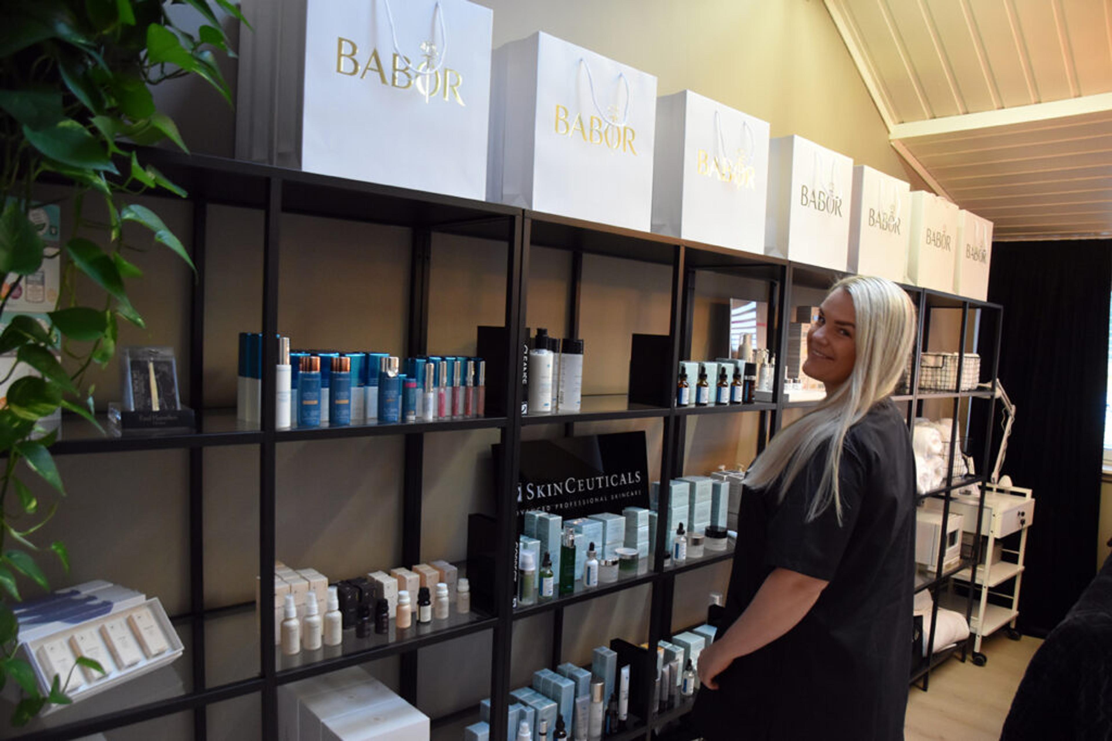 VELFYLTE HYLLER: Christel har både kunnskapen og produktene som skal til for å forbedre og balansere huden din. Til åpningsfesten i dag kommer også representanter fra leverandører. Foto: Stian Ormestad, ReAvisa.