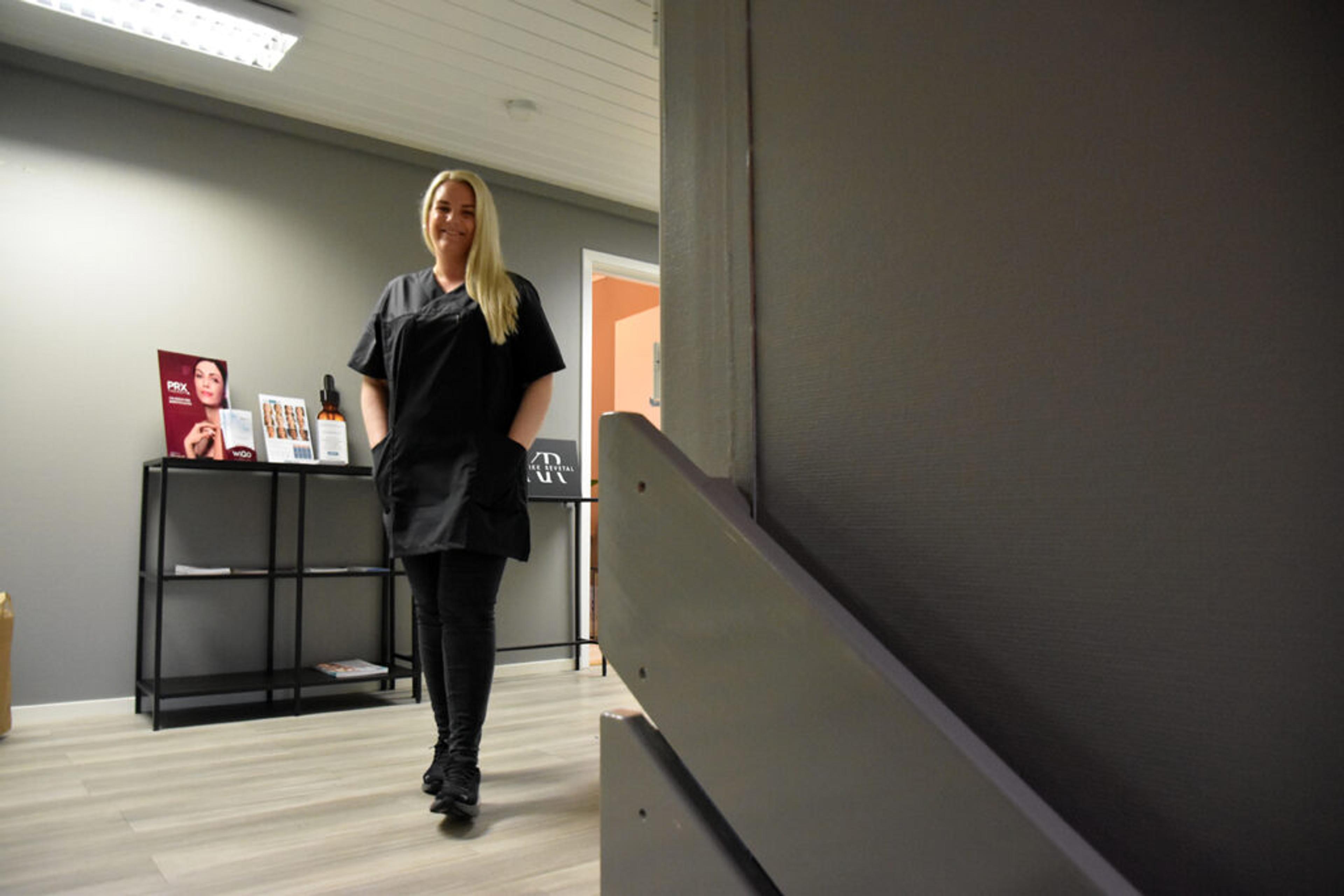 SPENT: Christel Lilleby (33) har gått all in, forteller hun. I delvis mammaperm blir det en forsiktig start med timer på kvelder og i helger. Du finner Klinikk Revetal i Næringsbygget, på vestsida av Bispeveien. Foto: Stian Ormestad, ReAvisa.