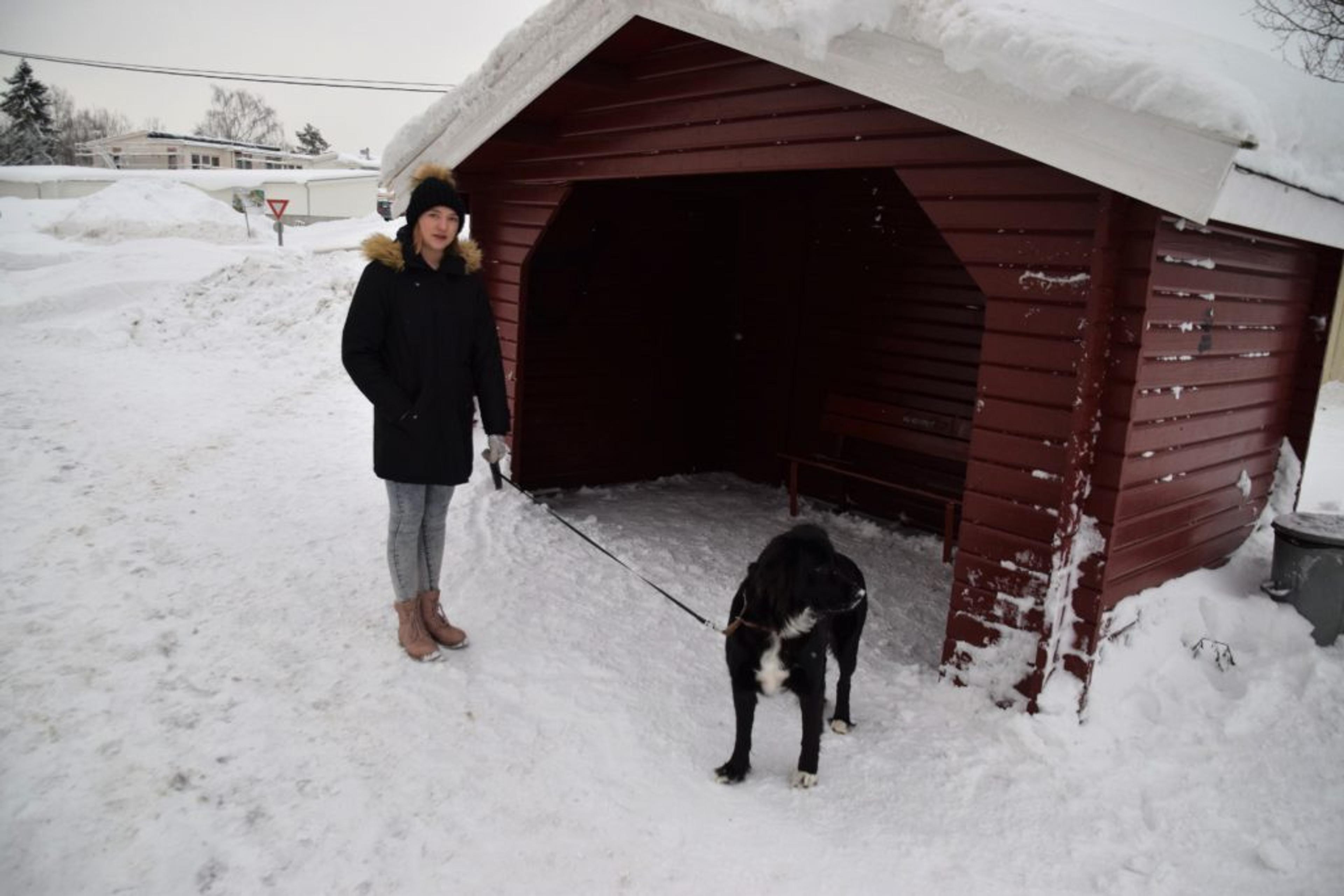 PREGA AV HENDELSEN: Miriam veit at Våle er et trygt sted, men hun har blitt skeptisk til å være aleine etter det som skjedde her, ved busskuret på Kirkevoll skole. – Hvis dama blir finni og får riktig oppfølging, vil det gjøre meg tryggere, fortalte hun til ReAvisa da vi møtte henne og Lotta i starten av denne uka. Foto: Stian Ormestad.