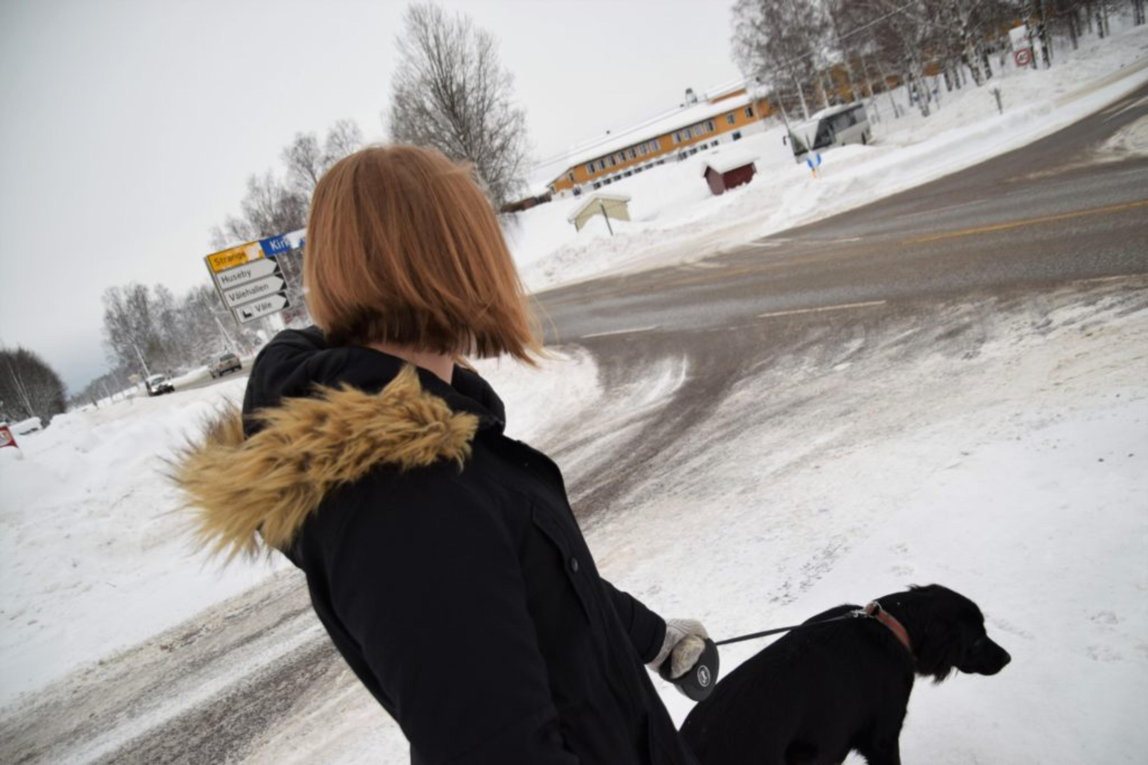 PREGA AV HENDELSEN: Miriam veit at Våle er et trygt sted, men hun har blitt skeptisk til å være aleine etter det som skjedde her, ved busskuret på Kirkevoll skole. – Hvis dama blir finni og får riktig oppfølging, vil det gjøre meg tryggere, fortalte hun til ReAvisa da vi møtte henne og bikkja Lotta etter overfallet. Foto: Stian Ormestad.