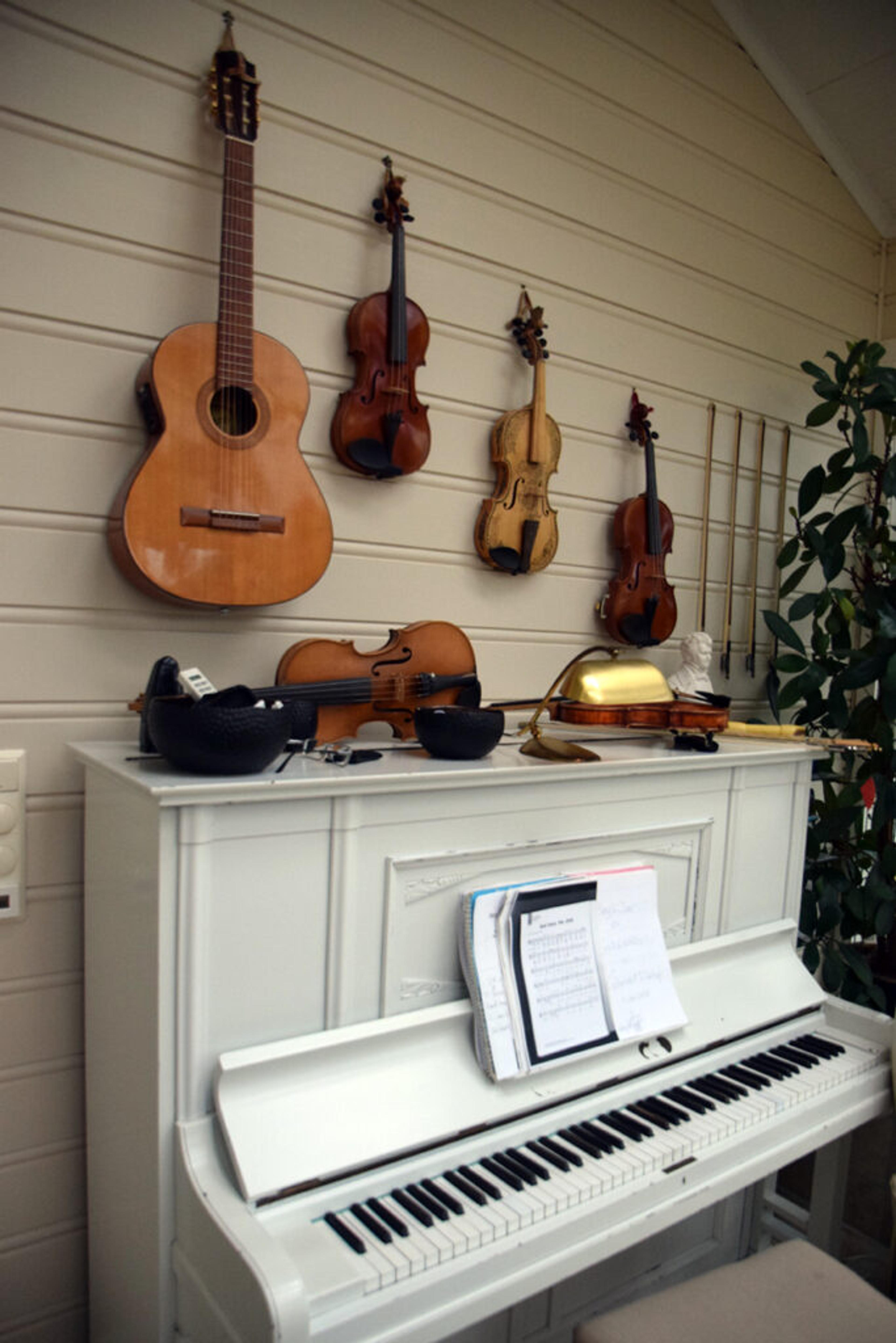 HOBBYROM: En overbygd terrasse med instrumenter og utsikt over Ramnes-slettene, her kan Knut bråke og holde på så mye han bare vil. Foto: Stian Ormestad.