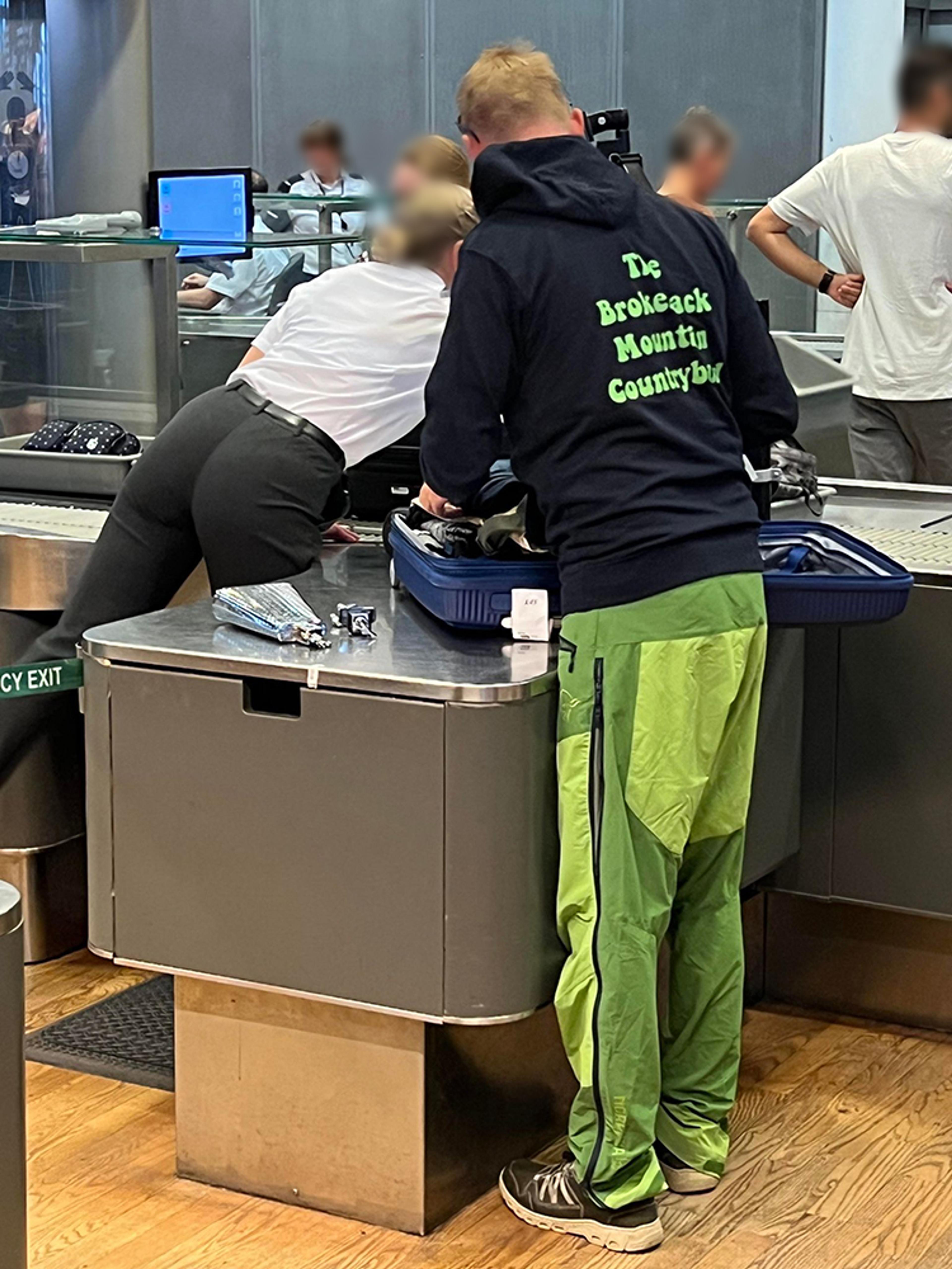 BJELLE-TRØBBEL PÅ VEI TIL KJØLLEFJORD: Det ble litt trøbbel i sikkerhetskontrollen: – Vokalisten ble tatt med bjella i kofferten, som resulterte i full ransakelse. Med blå gummihansker. Foto: Privat.