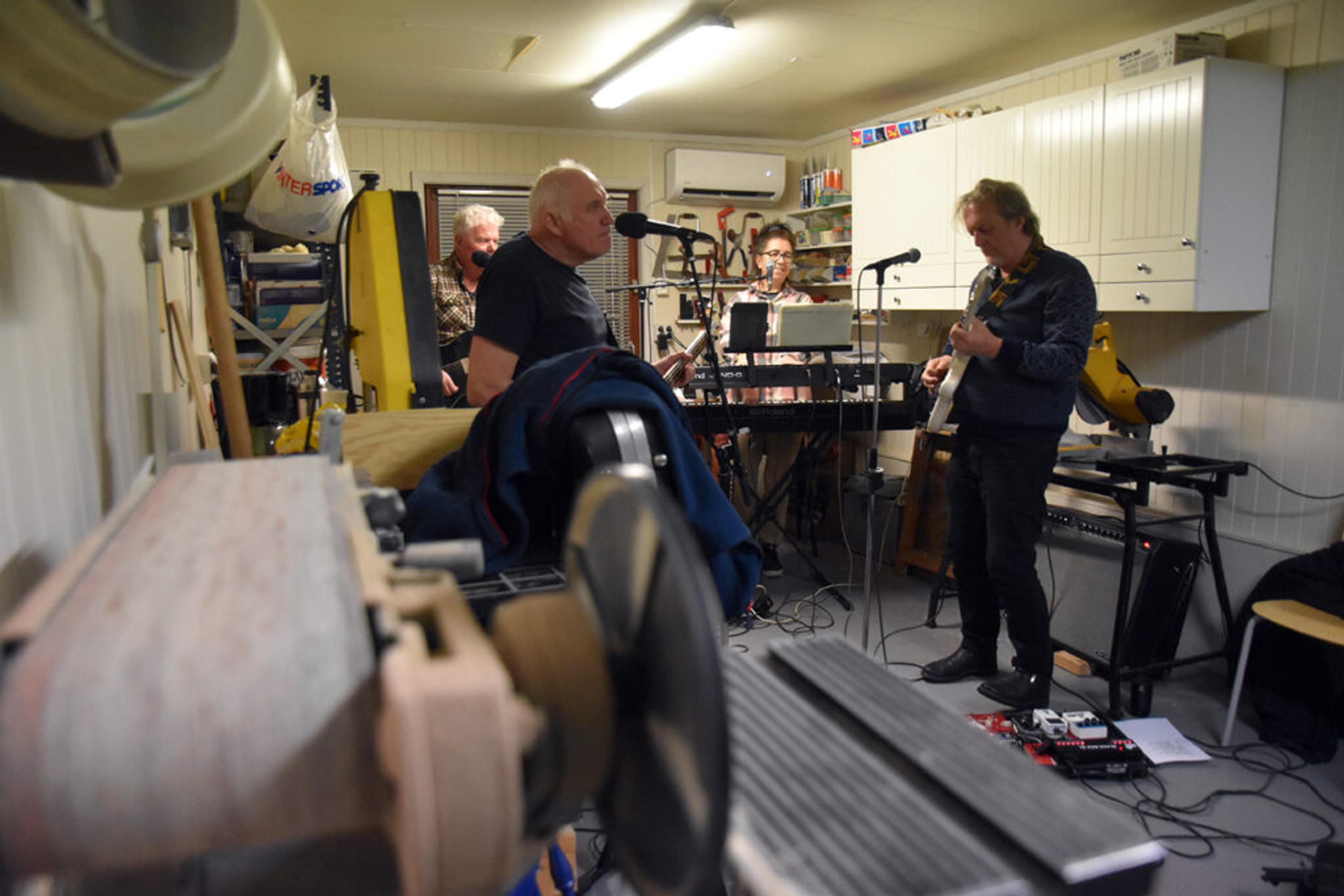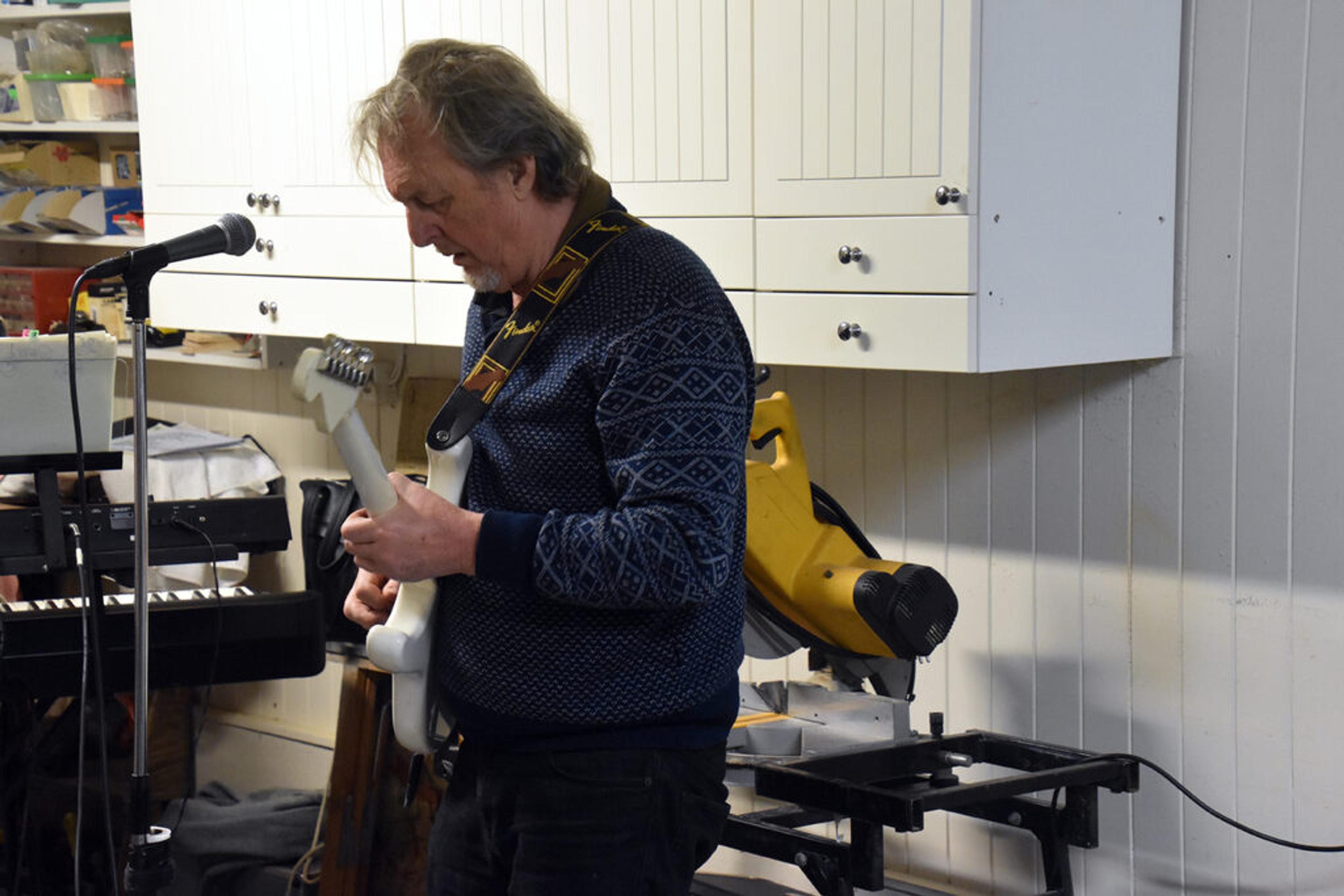 MASKINER OG MUSIKK: Harald Andreas Knutsen har kort vei fra gitarsolo til rette redskap, hvis han skulle få behov for å kappe noe i to. Garasjen til Anders funker fint som snekkerverksted og musikkverksted. Foto: Stian Ormestad, ReAvisa.