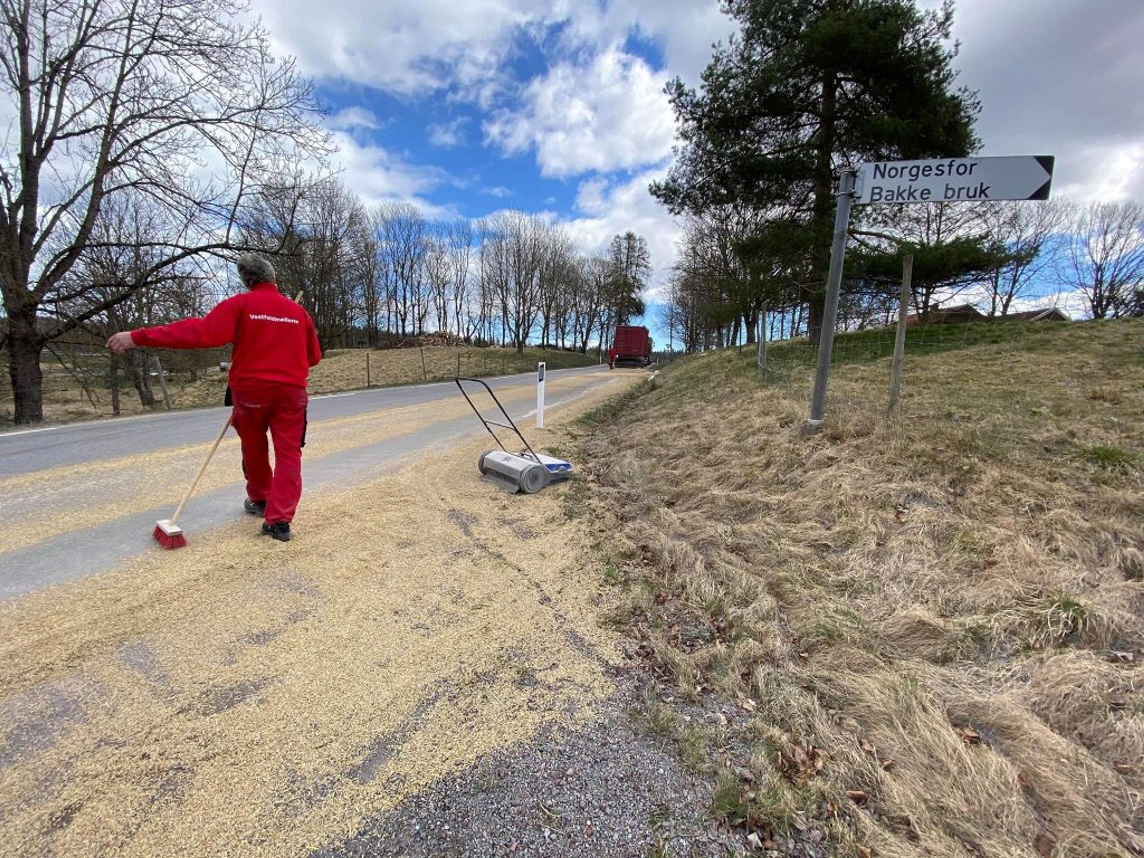 KORN OVERALT: Det er full aktivitet for å rydde opp i kornlasset som havna i Fossanveien. Foto: Stian Ormestad.