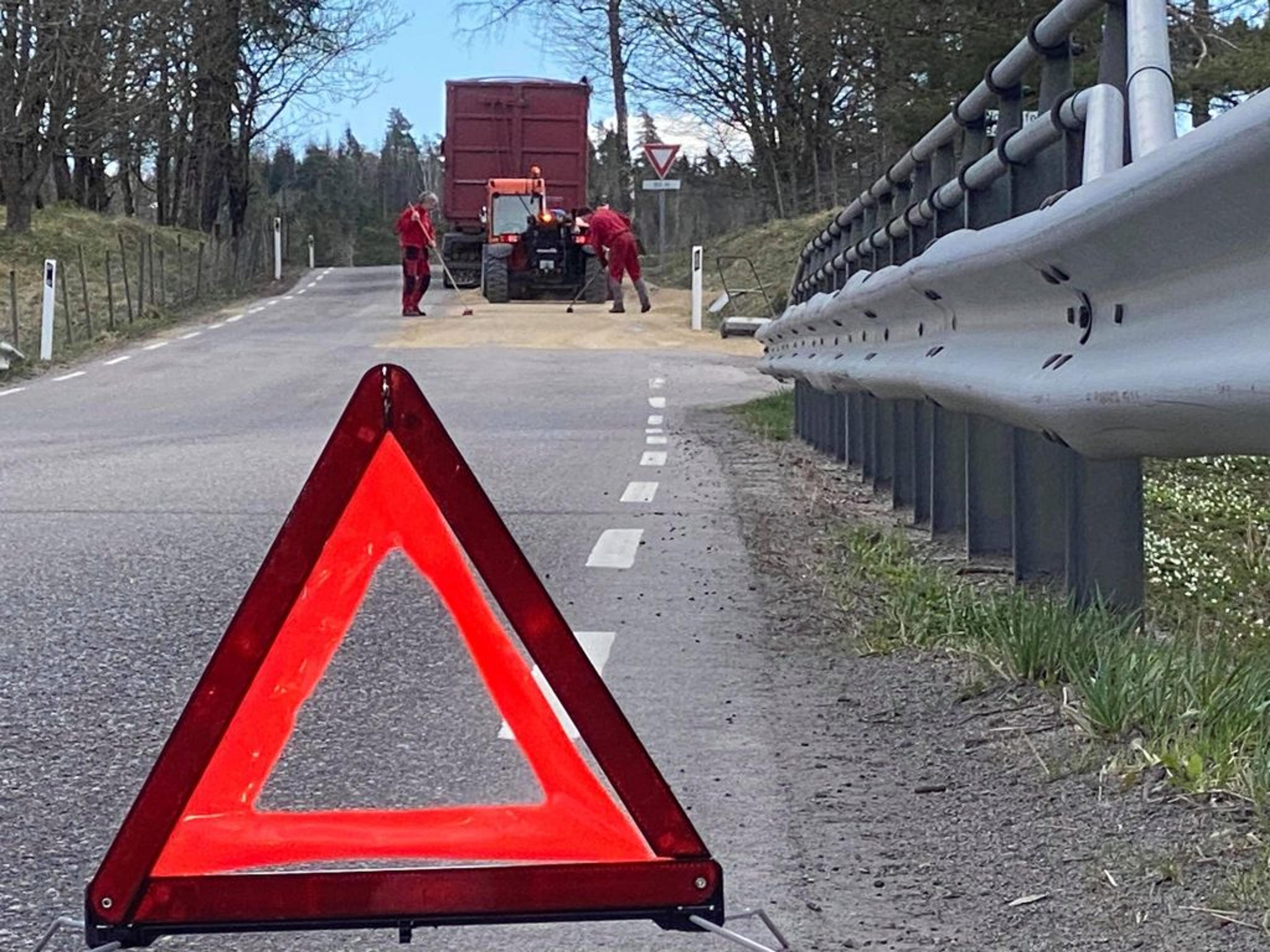 Det var rett over klokka 12.00 torsdag 16. april at kornlasset velta ut i veien.