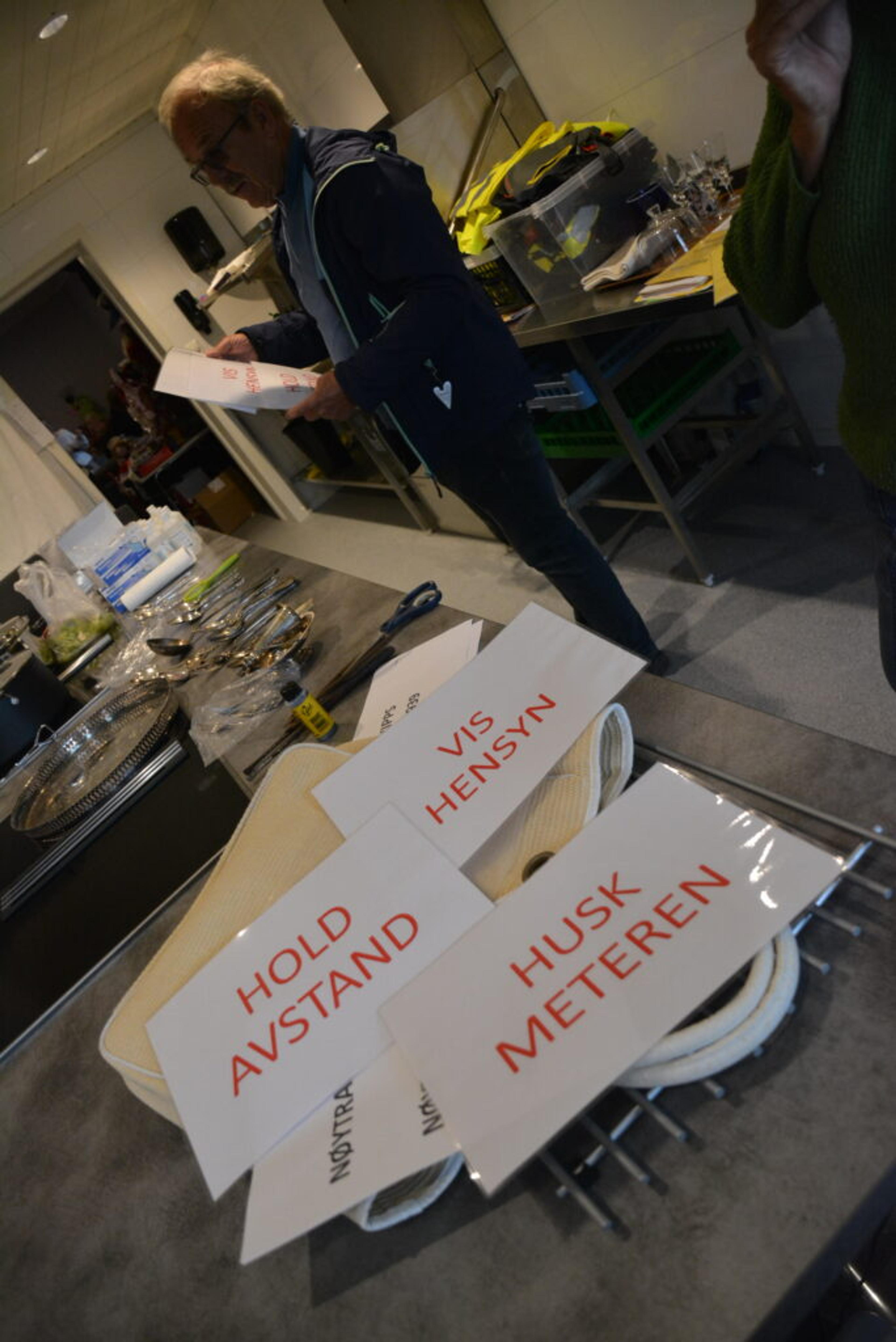 KORONA-PLAKATER: – Vi får håpe disse kan gå i søpla for evig og alltid etter lørdagen, sier Klaus Holt om 1-meters-plakatene. Foto: Stian Ormestad.