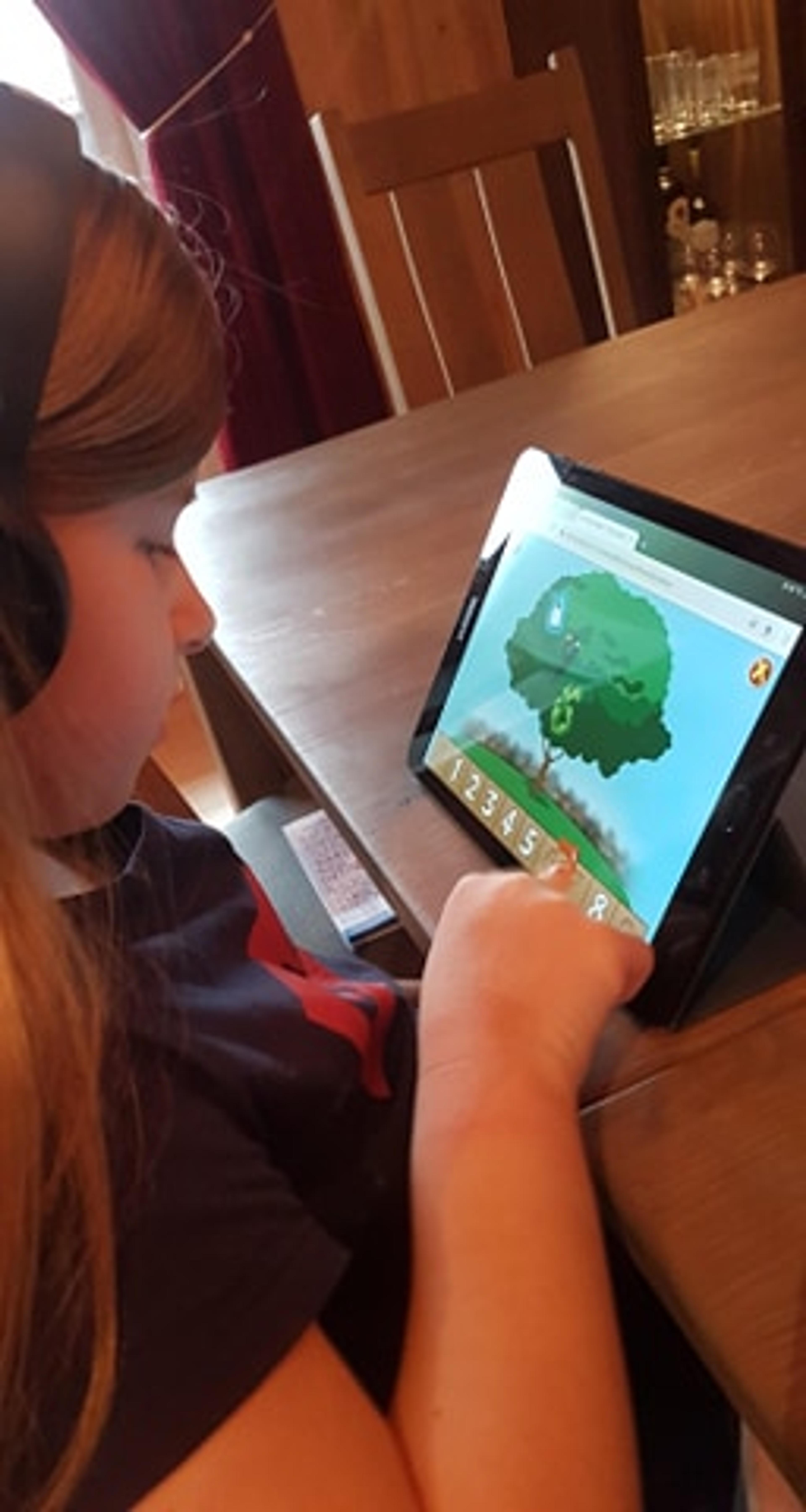 UBEGRENSA SKJERMTID? Mange familier mykner opp i reglene rundt skjermtid om dagen. Her er Camilla (7) i full gang med lek og læring. Gyldendal har åpna Salaby og Salaby barnehage for alle. Foto: Privat.