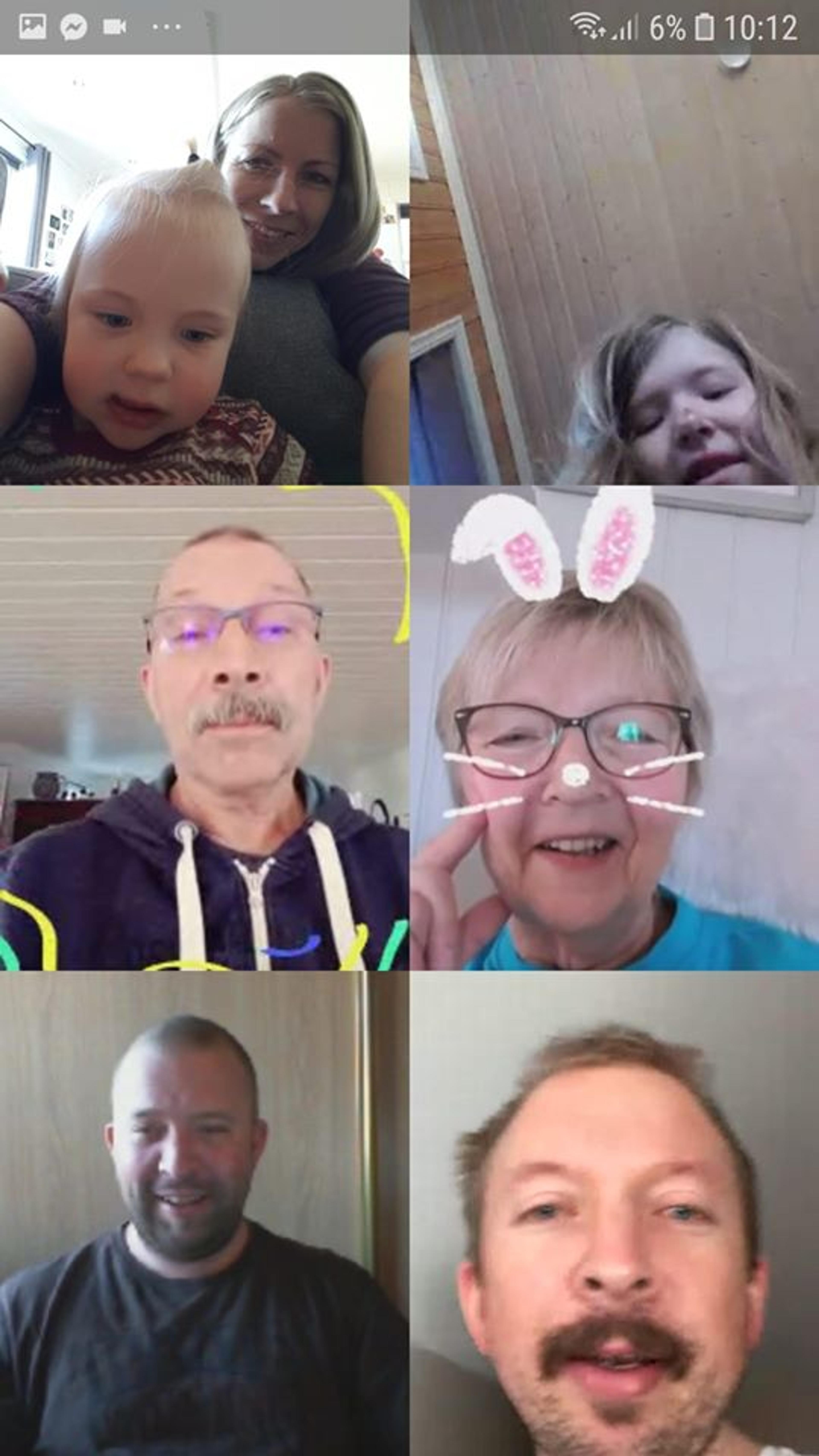 BURSDAG-CHAT: Familien samles til en digital bursdagsfeiring for 7-åringen oppe i høyre hjørne. Foto: Privat.