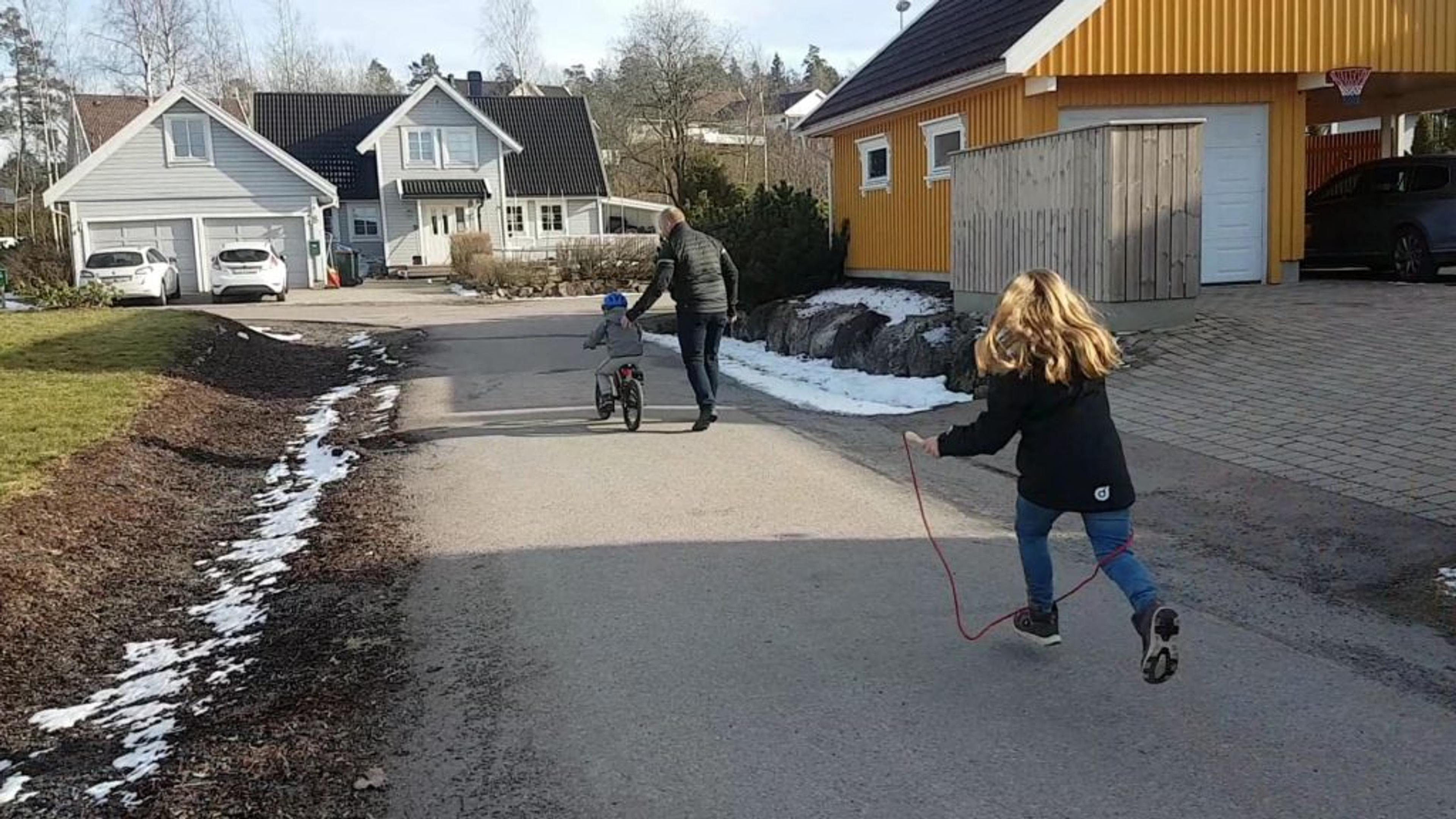 – Vi har familiemedlemmer i risikogruppa, og de har vi ikke møtt siden før vi dro på ferie. Men vi video-ringer rundt omkring til venner og familie. Også har vi vært en tur ute i hagen og på lekeplassen ved huset.