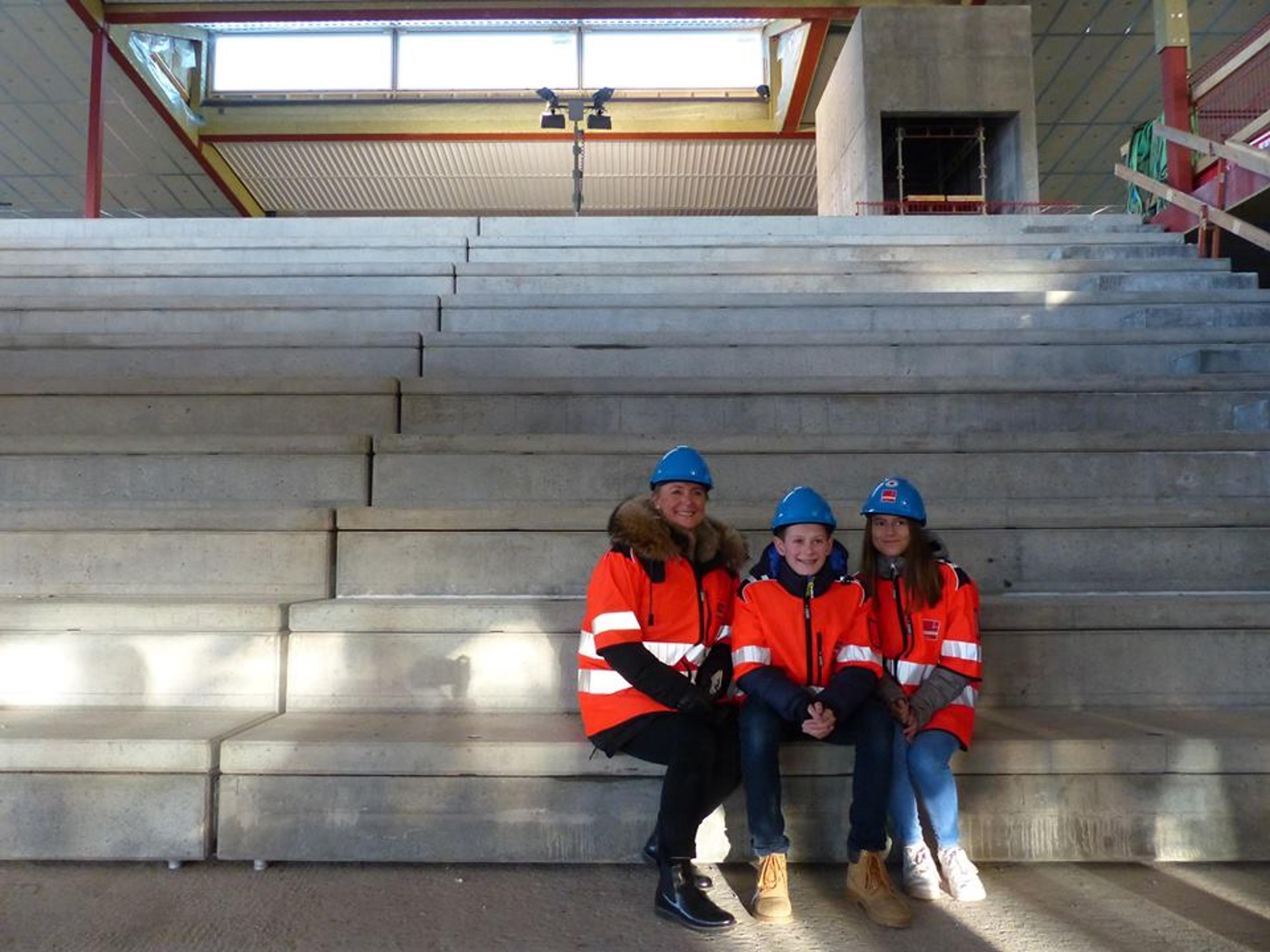 TETT BYGG: Revetal ungdomsskole-rektor Mona Larsen prøvesitter det nye amfiet på Revetal ungdomsskole sammen med to elevrådsrepresentanter. Foto: Privat.