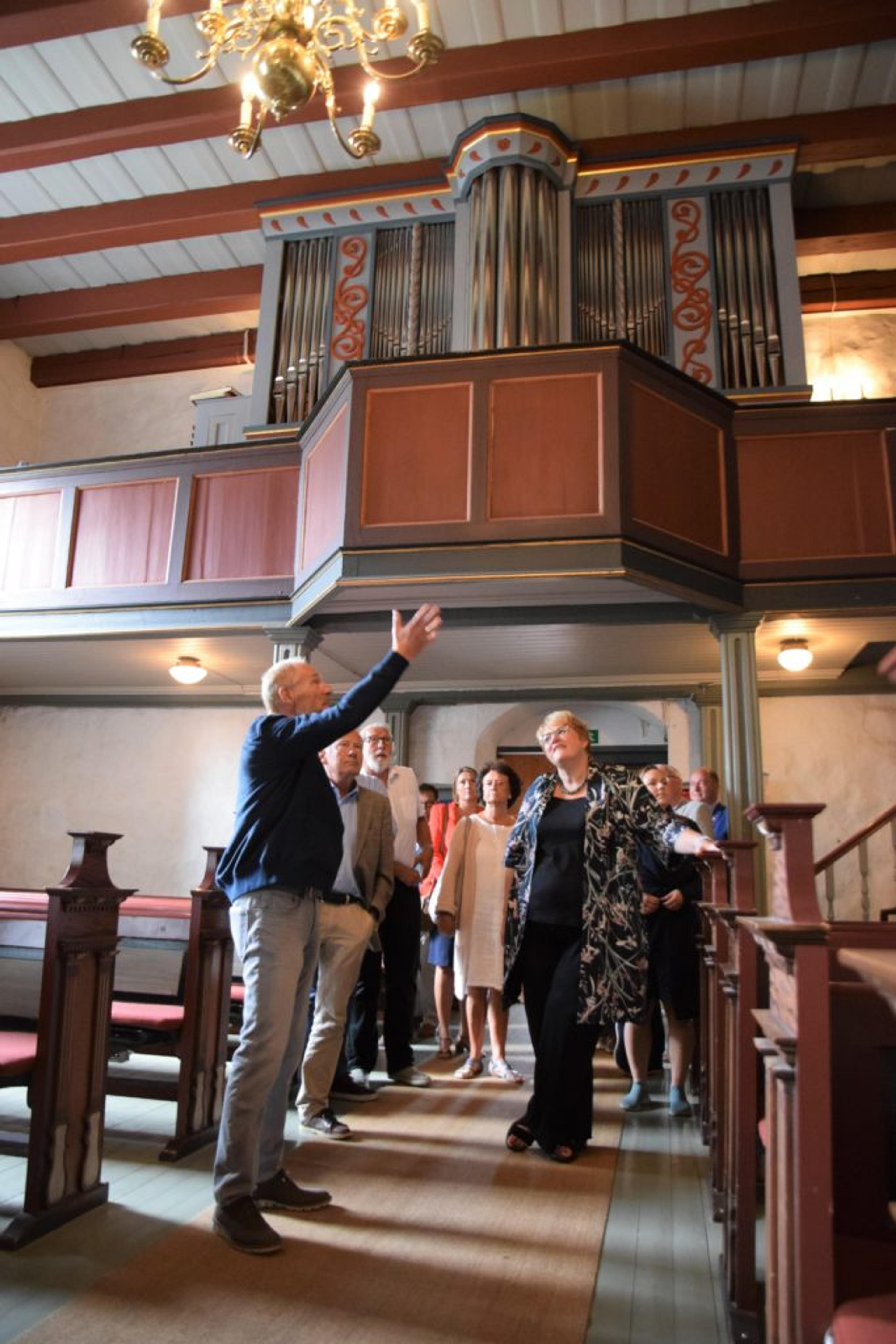 PÅ OMVISNING I RAMNES KIRKE: Kirkeverge Per Astrup Andreassen tok i mot kulturminister Trine Skei Grande (V) til Ramnes kirke tirsdag 7. august 2018. Foto: Stian Ormestad.