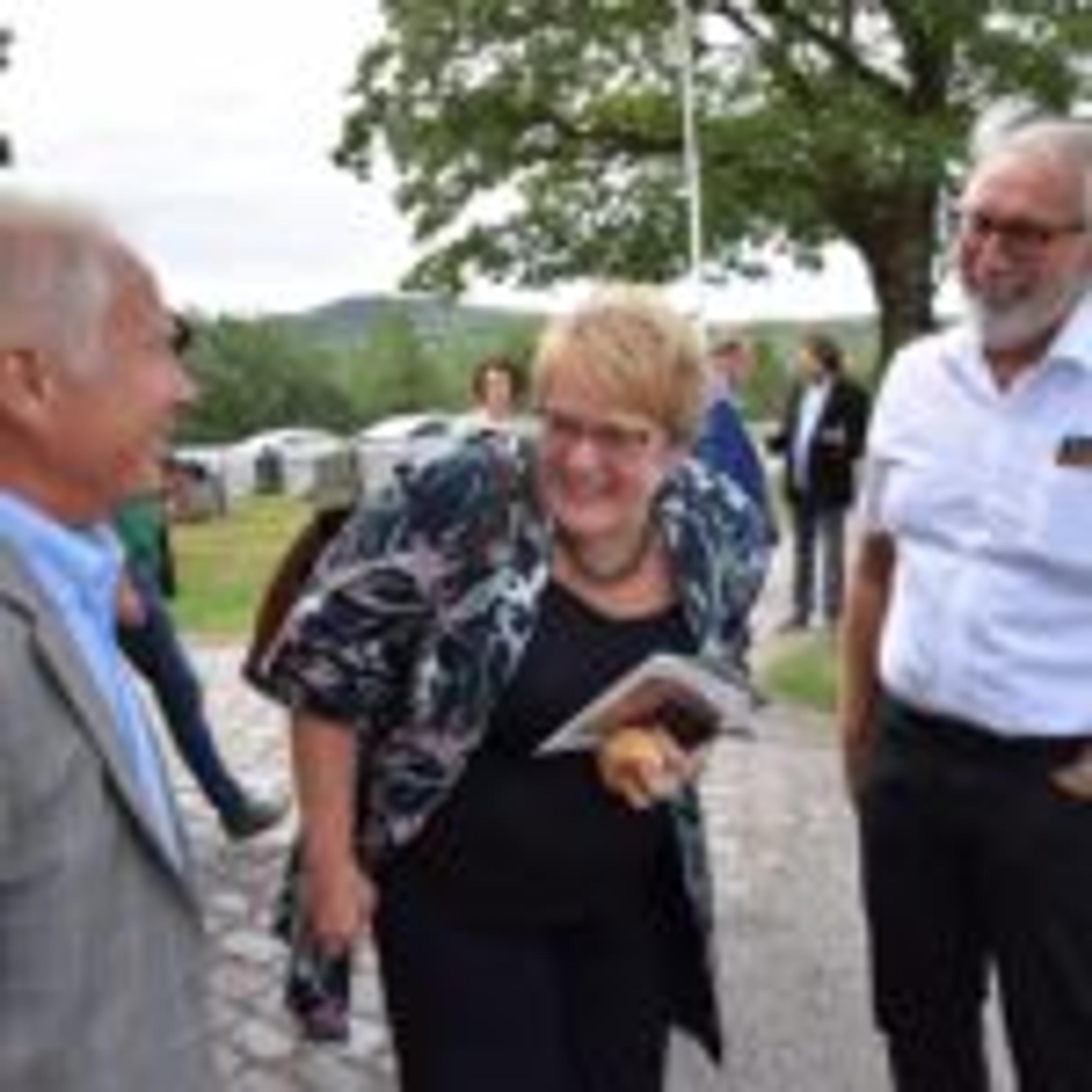 Kulturminister Trine Skei Grande (V) ble tatt i mot av kirkeverge Per Astrup Andreassen og resten av Re-delegasjonen med ordfører Thorvald Hillestad (SP) i spissen da hun besøkte Re tirsdag 7. august 2018.
