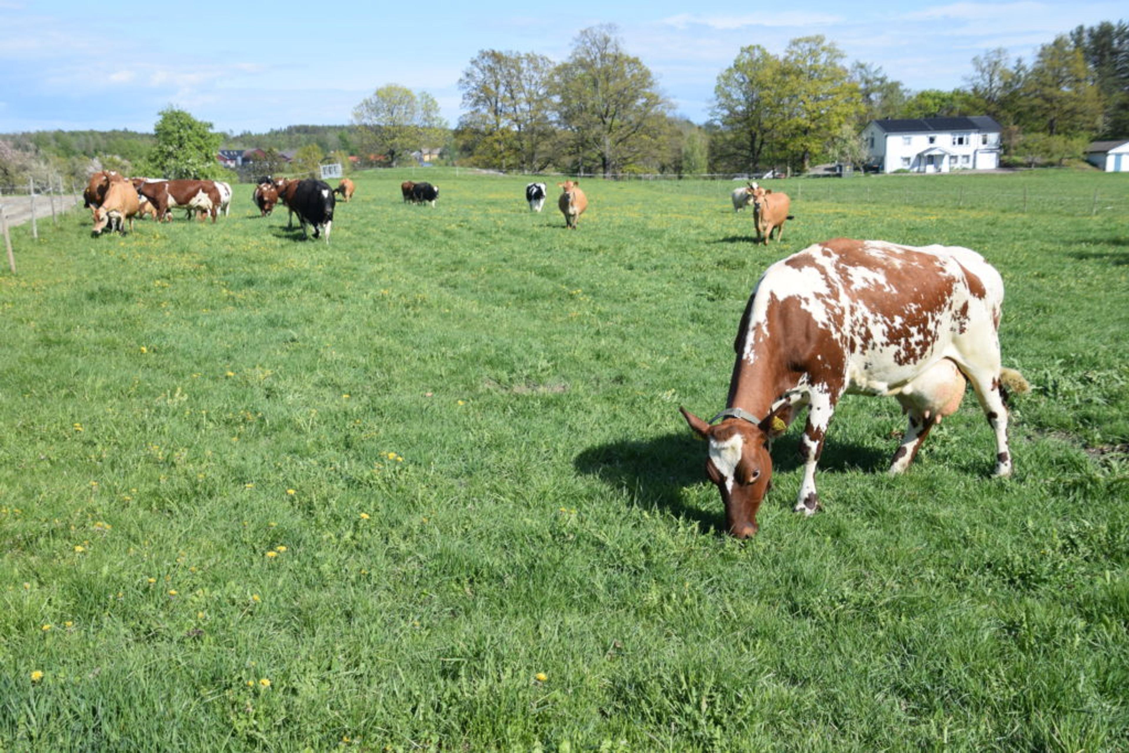 DEILIG GRØNT GRASS: Nå er kuene på Tufte gård sendt ut på sommerbeite. Foto: Stian Ormestad.