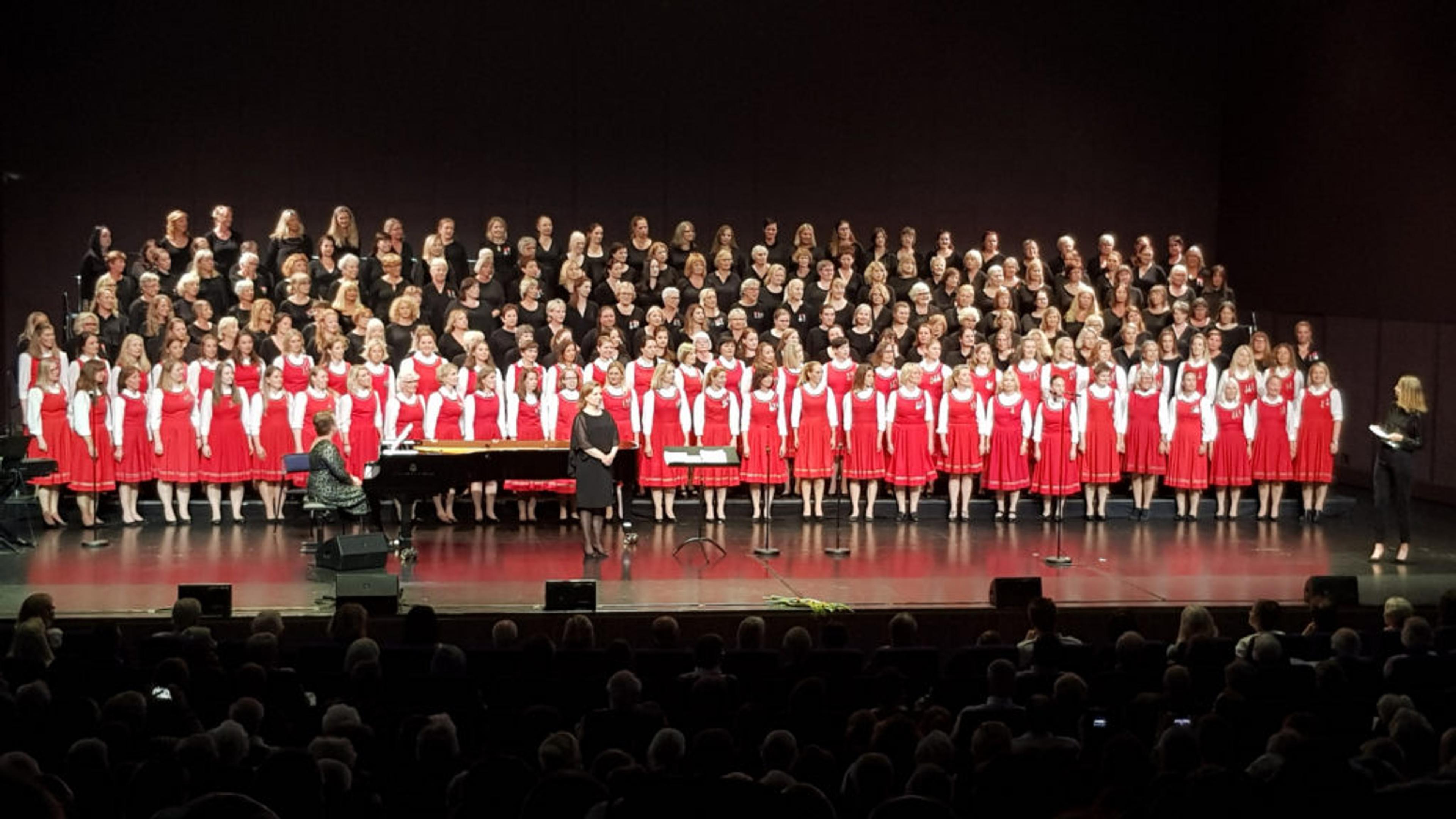 Sandefjord Jentekor ble samla for å hylle Mary og Sverre Valen, og hyllesten ble leda av Laila Therese Johansen. Foto: Tom Hansen.
