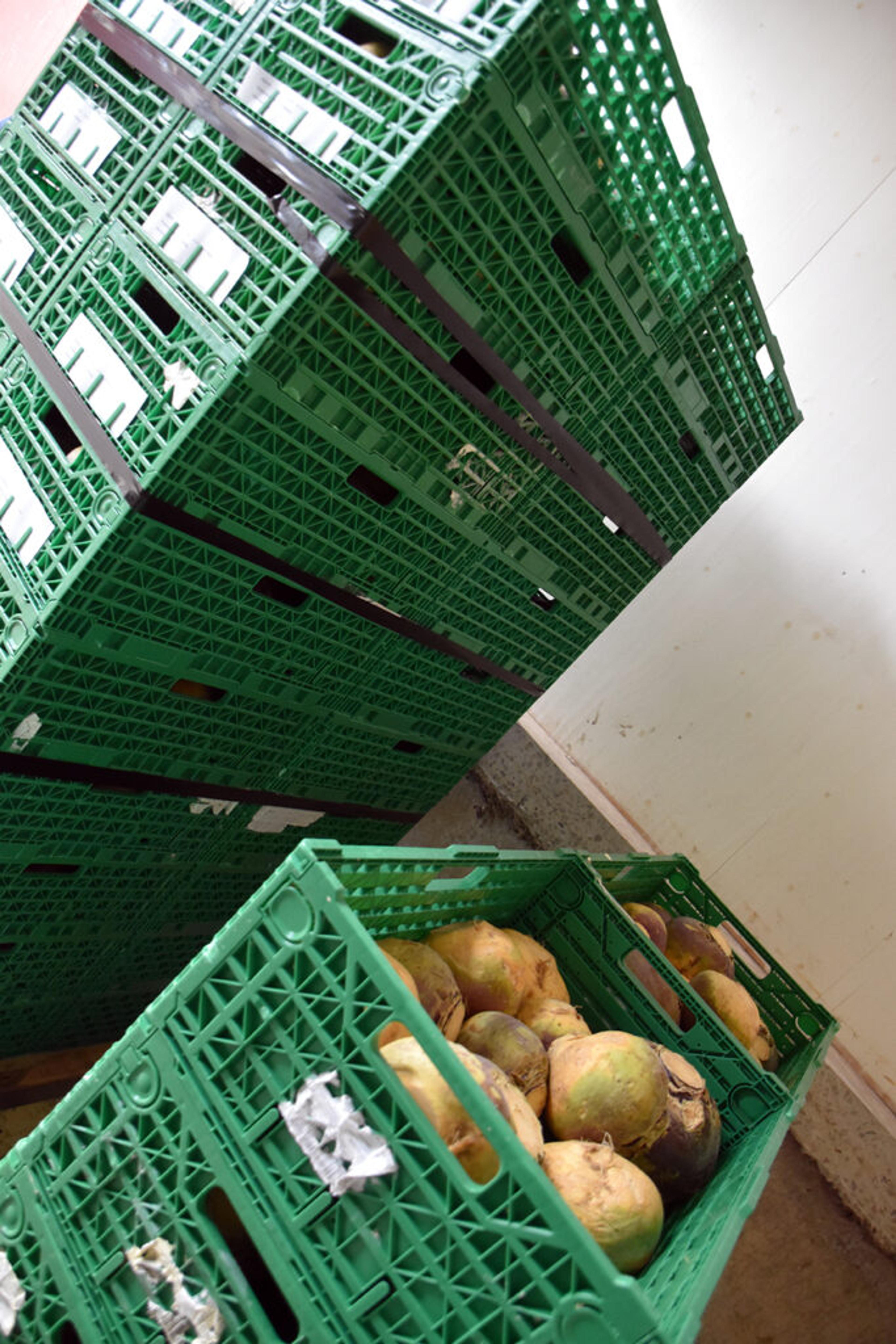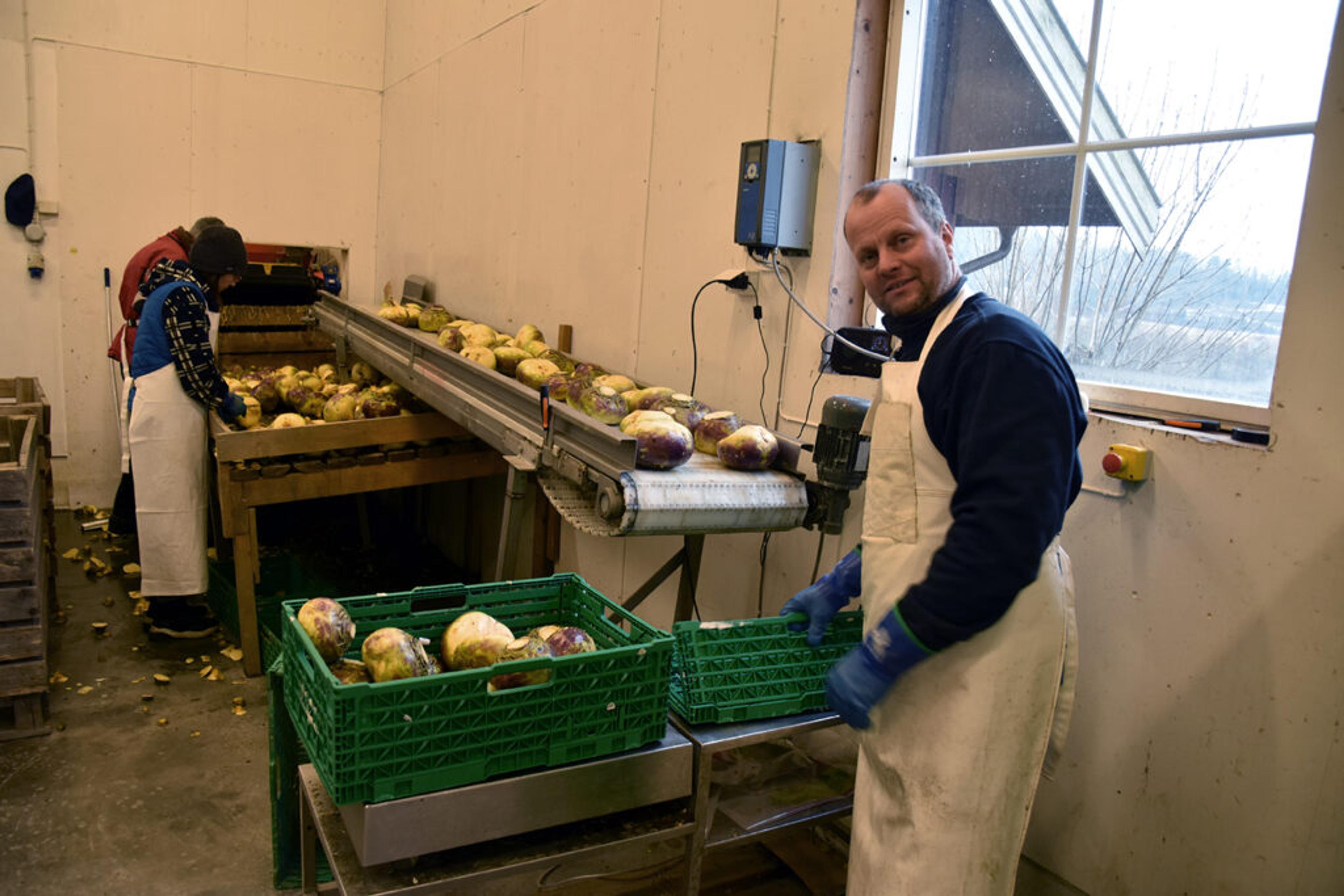 GJØR KLART TIL SALG: Kålrota dyrkes, lagres, vaskes, kvalitetskontrolleres, stables og pakkes helt klart til å legge i hylla på butikken – alt sammen står Paul Christen Eikeberg og hans folk på Hem gård i Undrumsdal for. Likevel får han bare litt under halvparten av det kålrota koster i butikken. Foto: Stian Ormestad.