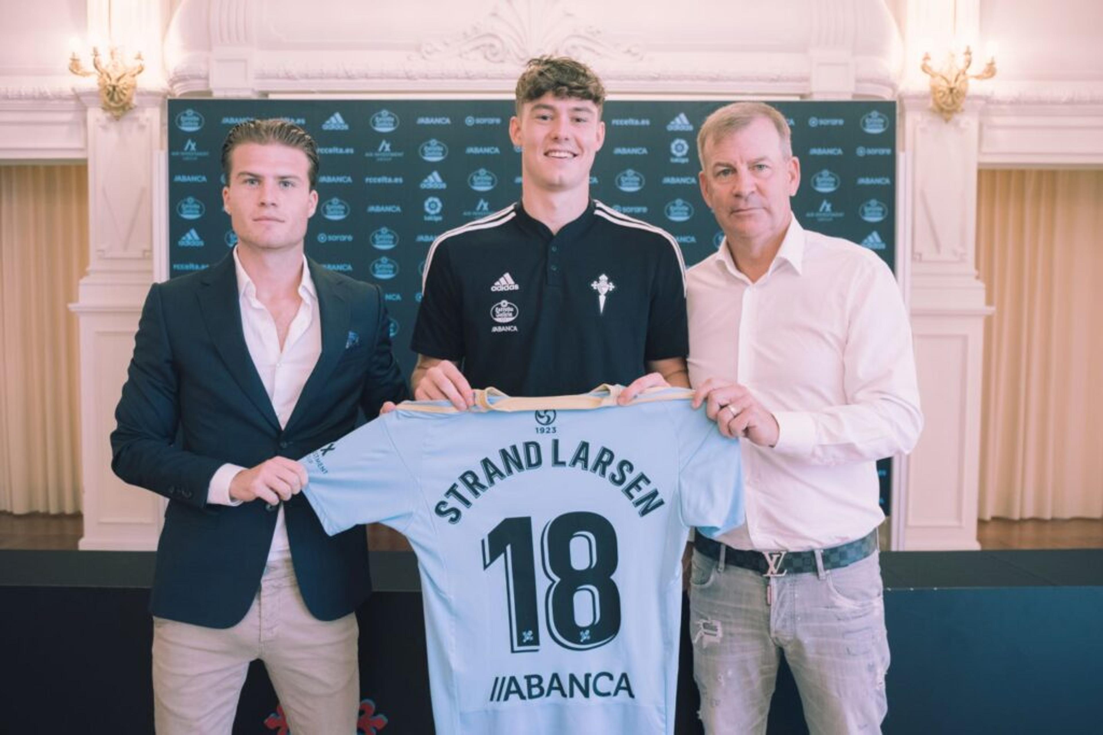 REKORD: Her har Re-gutten stått bak en overgang for hele 120 millioner kroner, du ser Patrick Ferreira lengst til venstre, videre fotballspilleren Jørgen Strand Larsen og Patricks agentkollega Tore Pedersen. Foto: Privat.