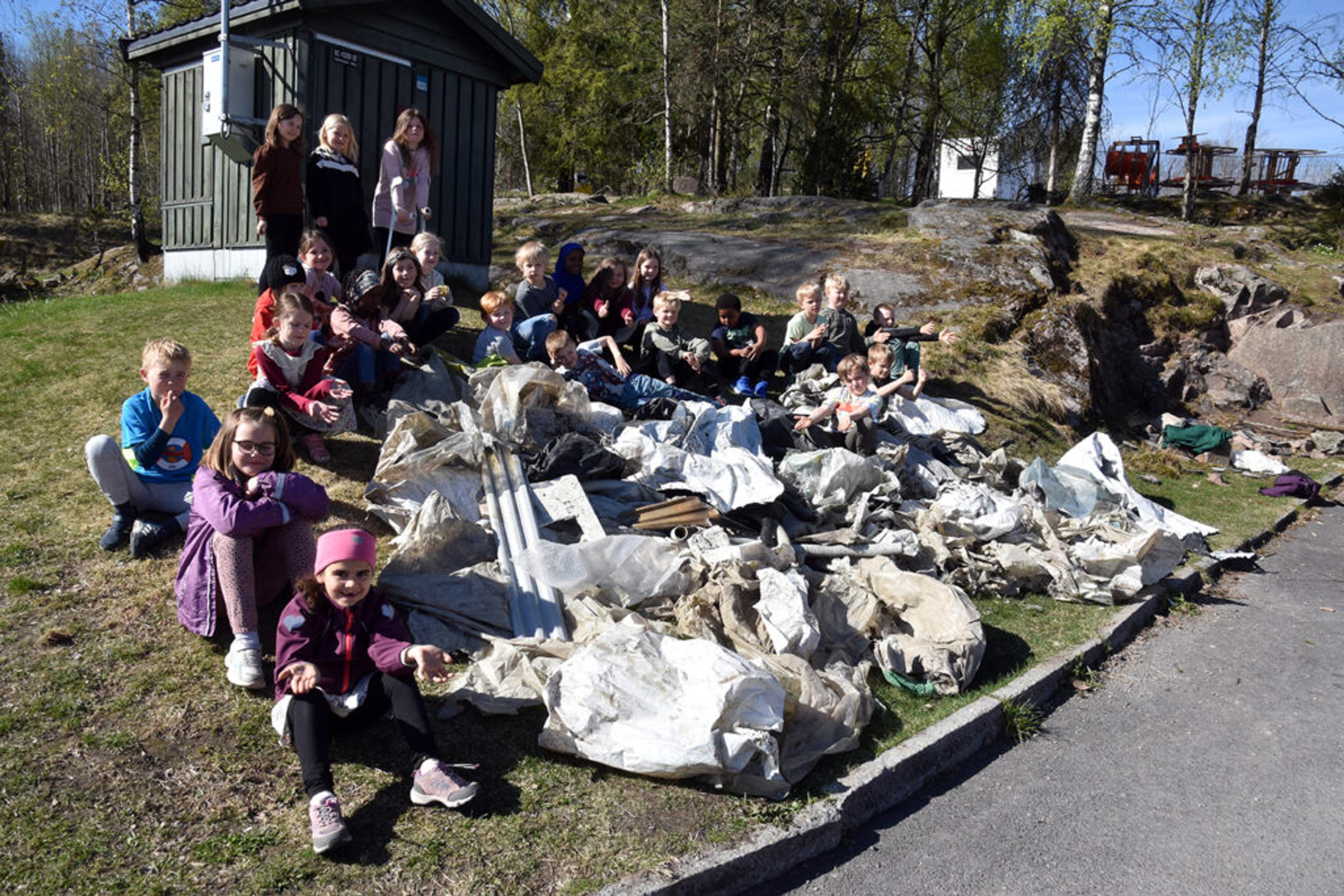 SJEKK SØPPELHAUGEN: Og dette er resultatet av bare den alle første dagen med søppelplukking, forteller 2. klassingene ved Røråstoppen skole, som rydder rundt skolen og i skogen før 17. mai. Foto: Stian Ormestad.