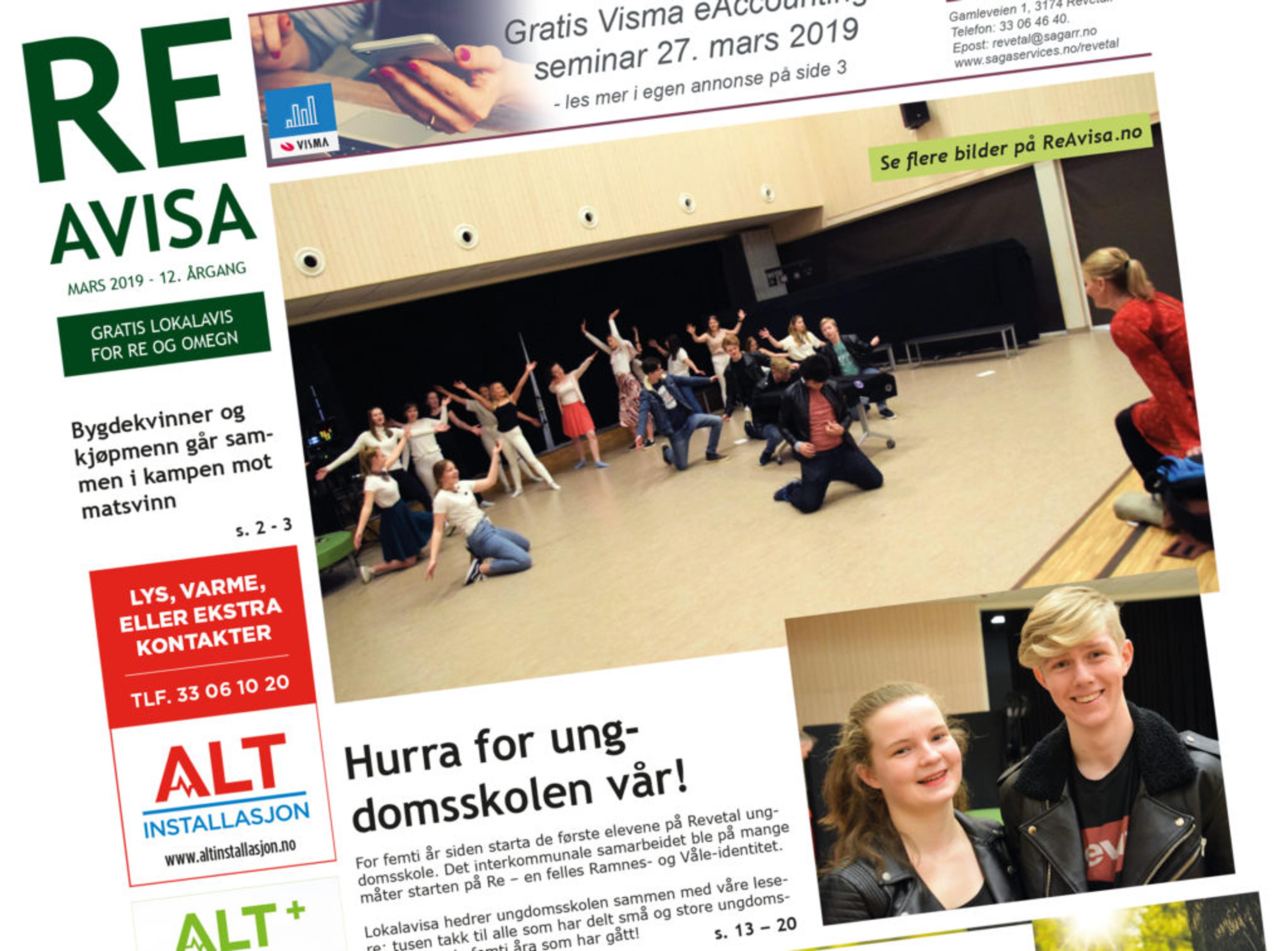 NY UTGAVE AV REAVISA! Torsdag 7. mars 2019 ligger ReAvisa i postkassene i Re og omegn – og avisa kan hentes der folk møtes på butikker, restauranter og bensinstasjoner – gratis. Og den kan allerede nå lastes ned her på nettavisa ReAvisa.no. Faksimile: Forsida på ReAvisa, mars 2019.