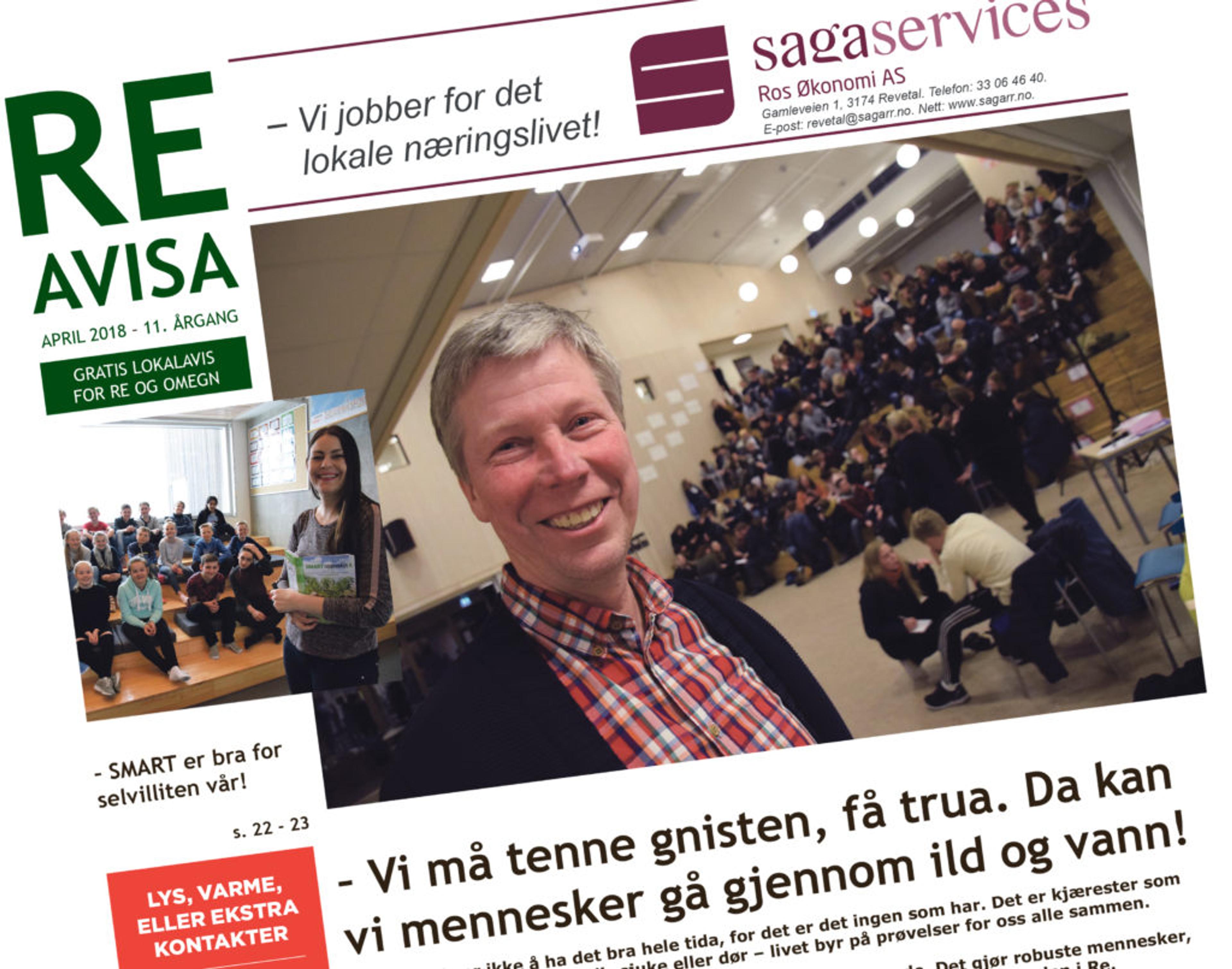 NY UTGAVE AV REAVISA! Torsdag 12. april 2018 ligger ReAvisa i postkassene i Re og omegn – og avisa kan hentes der folk møtes på butikker, restauranter og bensinstasjoner – gratis. Og den kan lastes ned her på nettavisa ReAvisa.no. Faksimile: ReAvisa, april 2018.