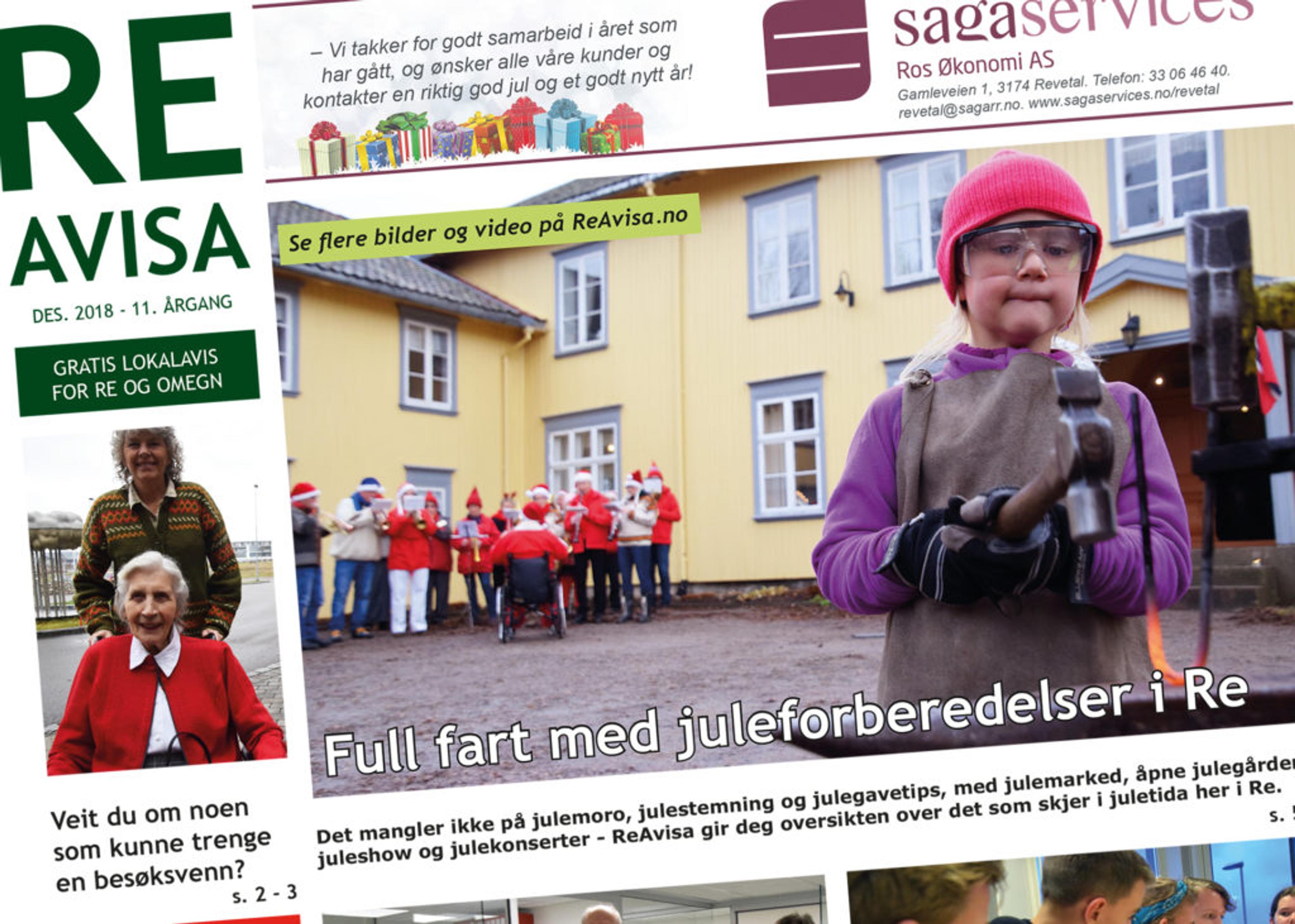 NY UTGAVE AV REAVISA! Torsdag 6. desember 2018 ligger juleavisa i postkassene i Re og omegn – og avisa kan hentes der folk møtes på butikker, restauranter og bensinstasjoner – gratis. Og den kan allerede nå lastes ned her på nettavisa ReAvisa.no. Faksimile: ReAvisa, desember 2018.