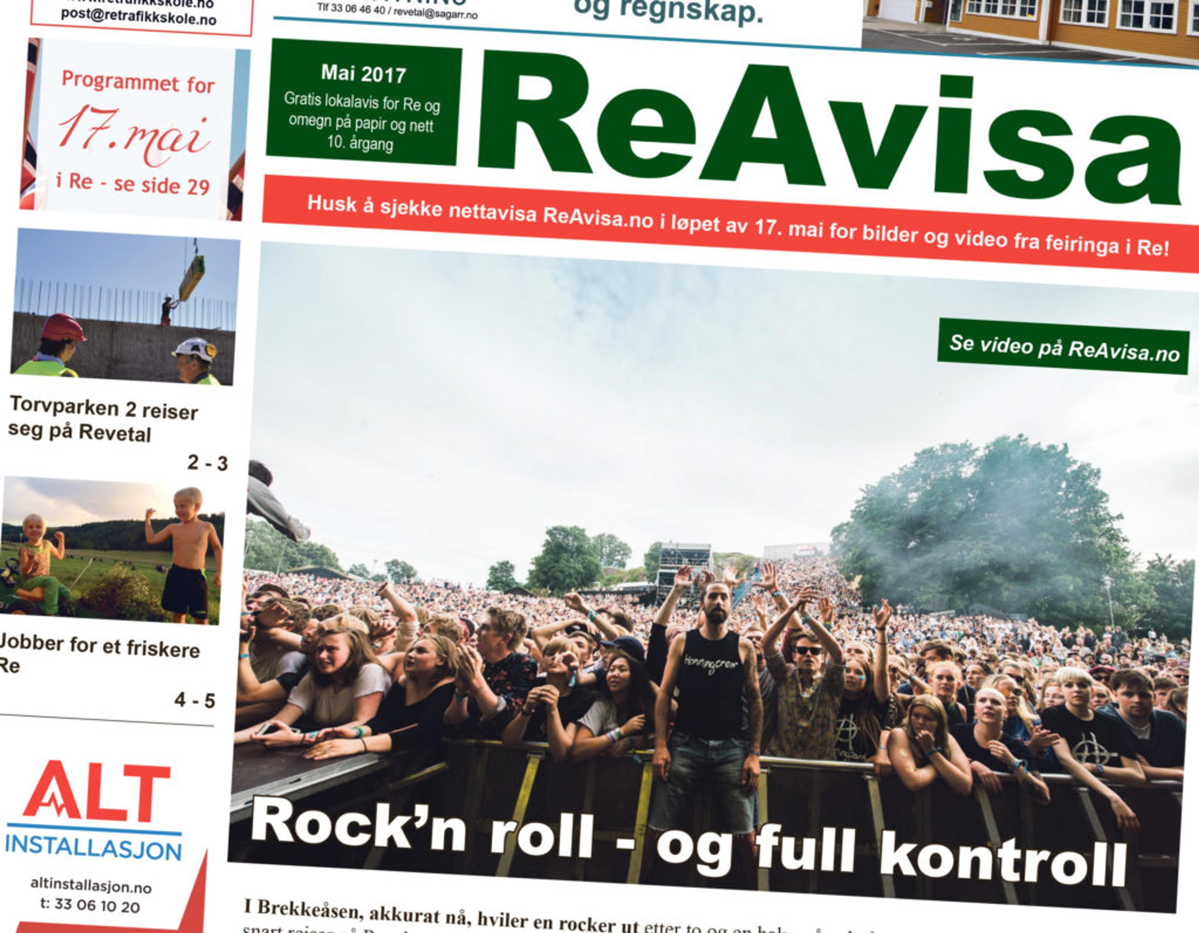 NY UTGAVE AV REAVISA! Torsdag 11. mai ligger ReAvisa i postkassene i Re og omegn – og den kan hentes der folk møtes på butikker, restauranter og bensinstasjoner – gratis. Og den kan lastes ned her på nettavisa ReAvisa.no. Faksimile: ReAvisa, mai 2017.