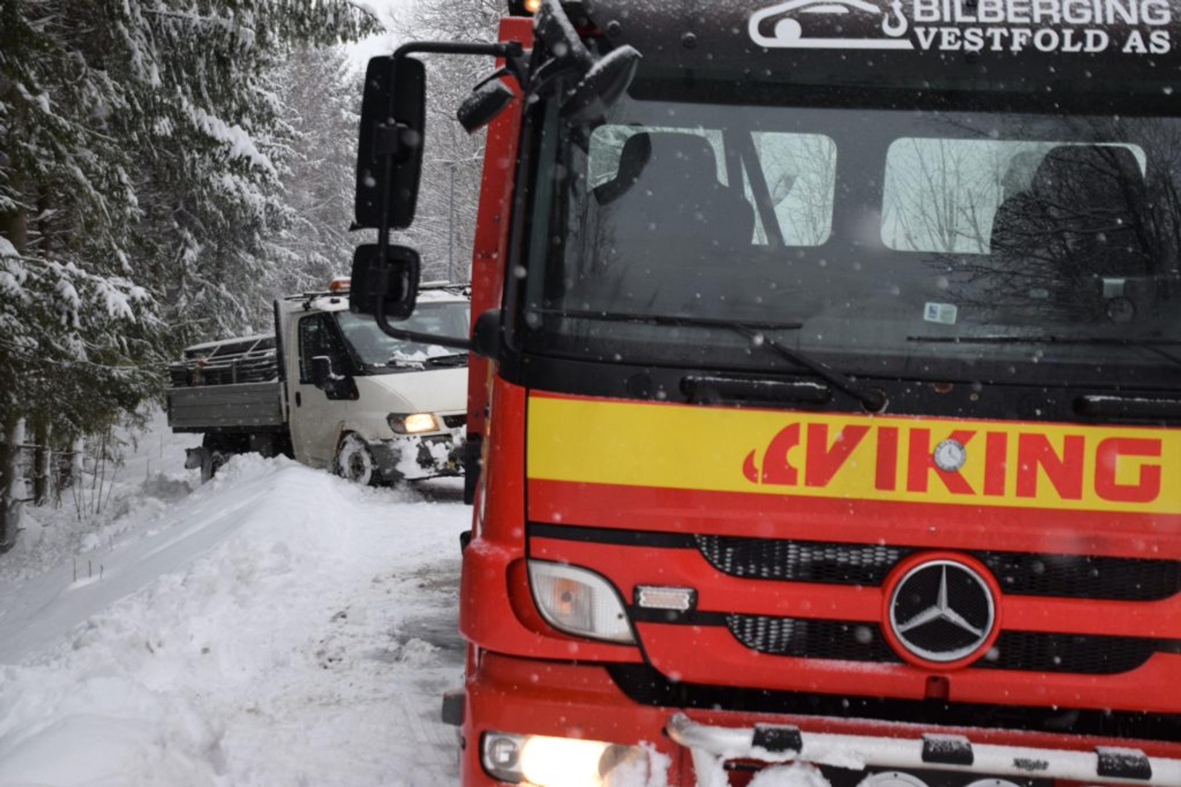 HAL I OG DRA! I 10.30-tida var både bergningsbil og den bergede oppe av grøfta og begge kunne komme seg videre til bilveien på Valleåsen-sida. Foto: Stian Ormestad.
