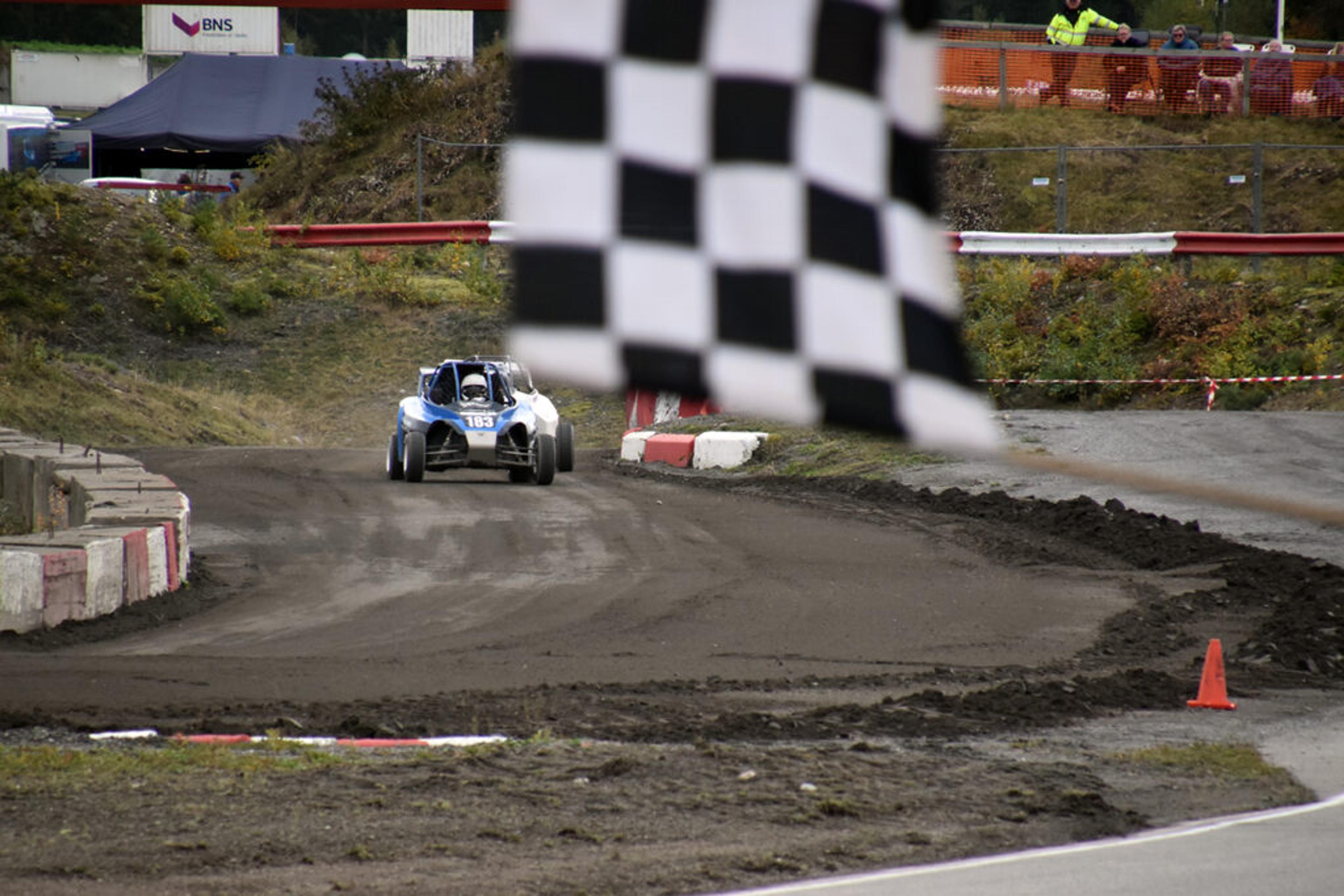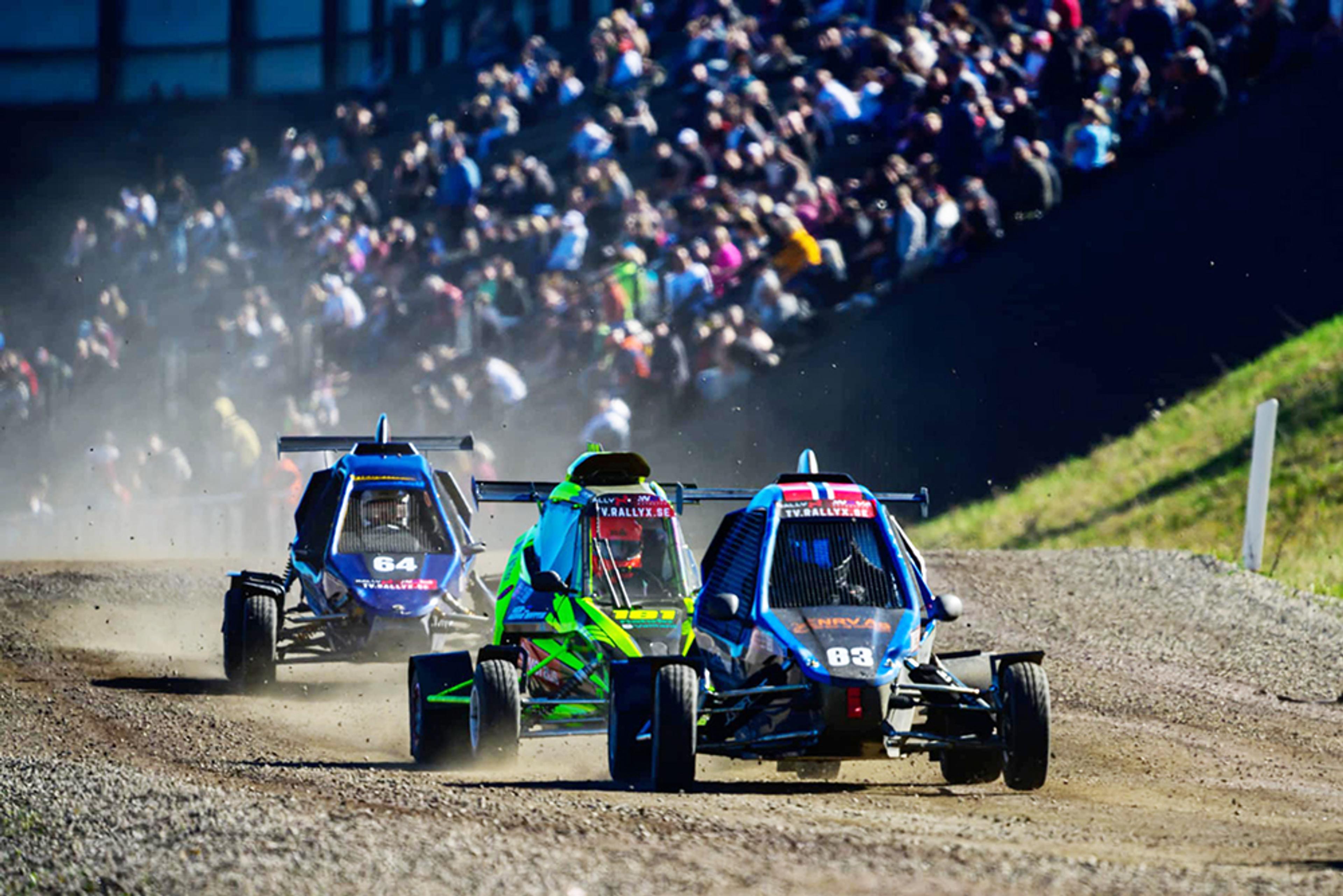 SATSER INTERNASJONALT: Lauritz Heum (15) leder her et heat i det nordiske mesterskapet RallyX, som både han og storebror Alexander Heum (20) satsa i i år og fortsetter å kjøre neste år. Foto: Jan Kåre Rafoss.