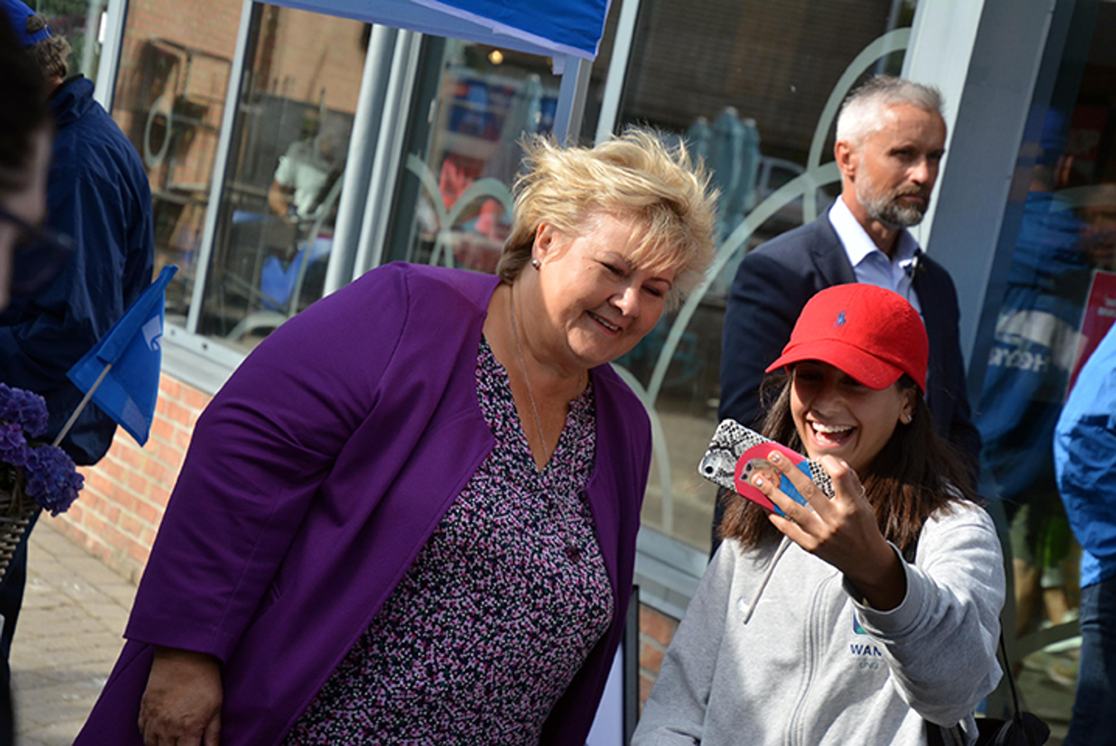 SELFIE MED ERNA PÅ RE-TORVET: Under stortingsvalgkampen i 2021 kom den gang statsminister Erna Solberg på Re-besøk, og da var Erna og Lavin sammen på forsida av den neste ReAvisa: – Jeg er litt fan, forteller 15-åringen som møtte Erna igjen i dag: – Ho er tøff og sier det hu mener. Arkivfoto: Stian Ormestad, ReAvisa.