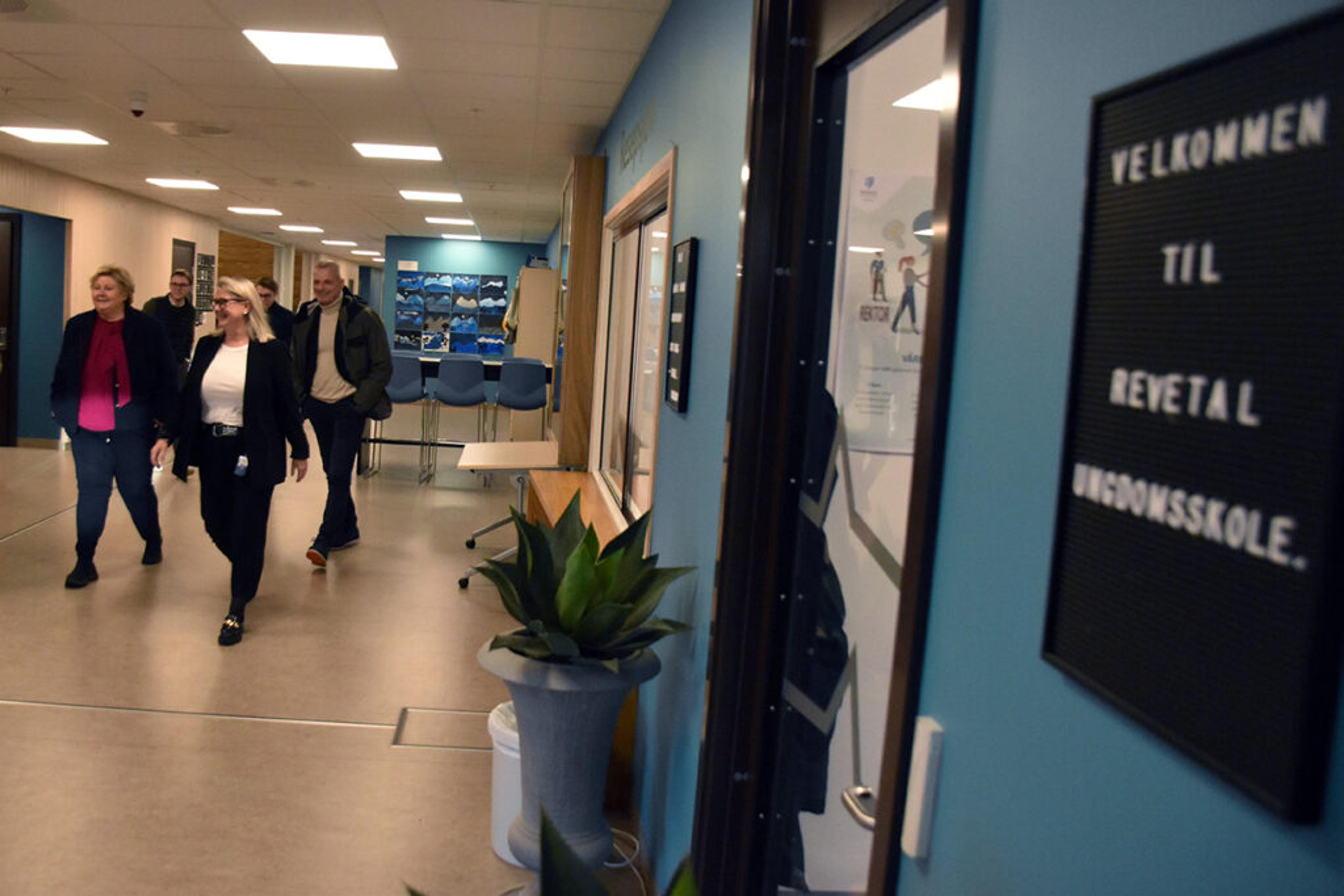 Erna Solberg, tidligere statsminister, og Frank Pedersen, ordførerkandidat, fronta et Høyre-følge på Re-besøk i dag. De besøkte Revetal ungdomsskole og var først innom styrkeklassen.