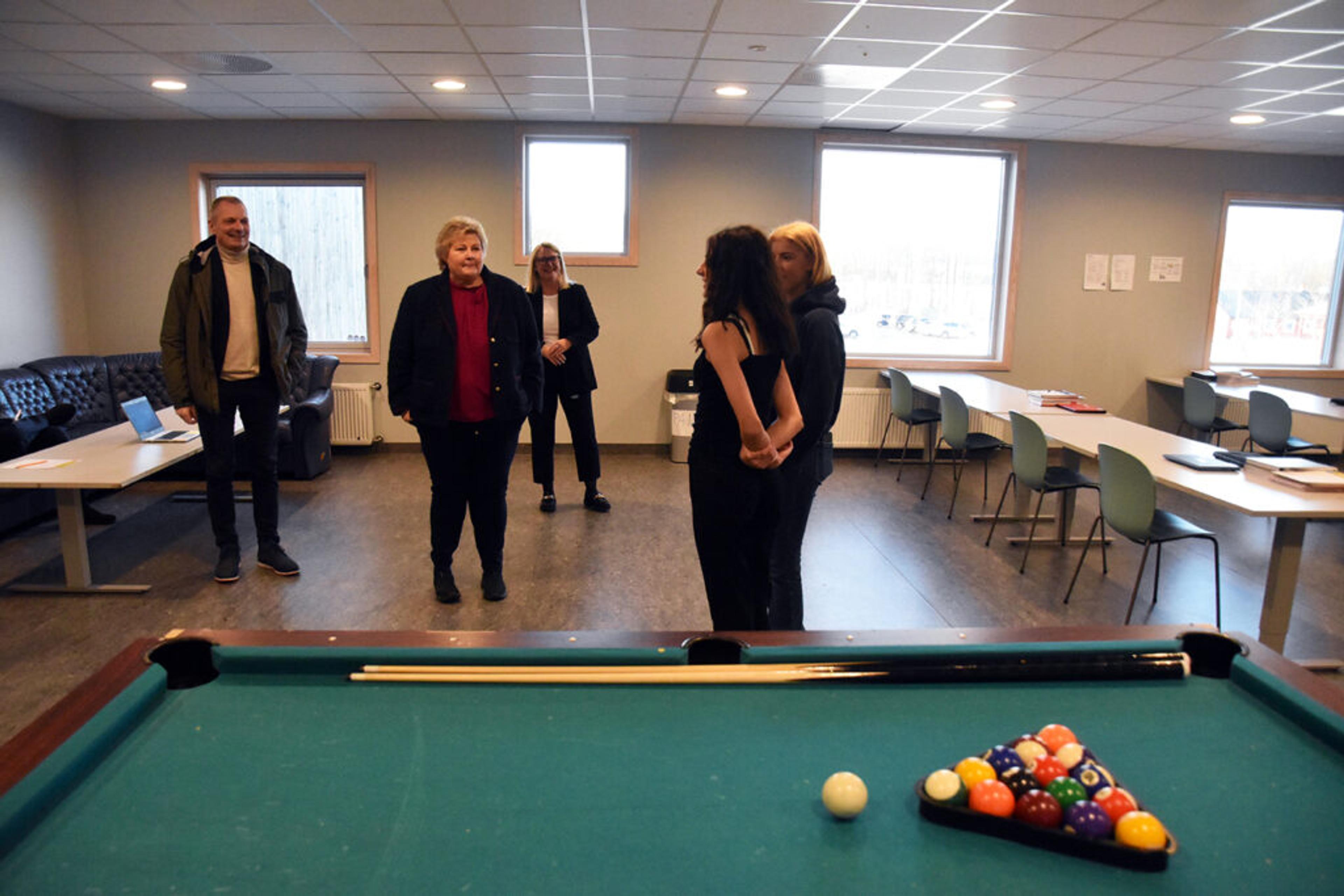 – SÅ FINT KLASSEROM! Erna lar seg imponere av mye på sitt Re-besøk i dag – også biljardbordet i klasserommet til styrkeklassen. Foto: Stian Ormestad, ReAvisa.