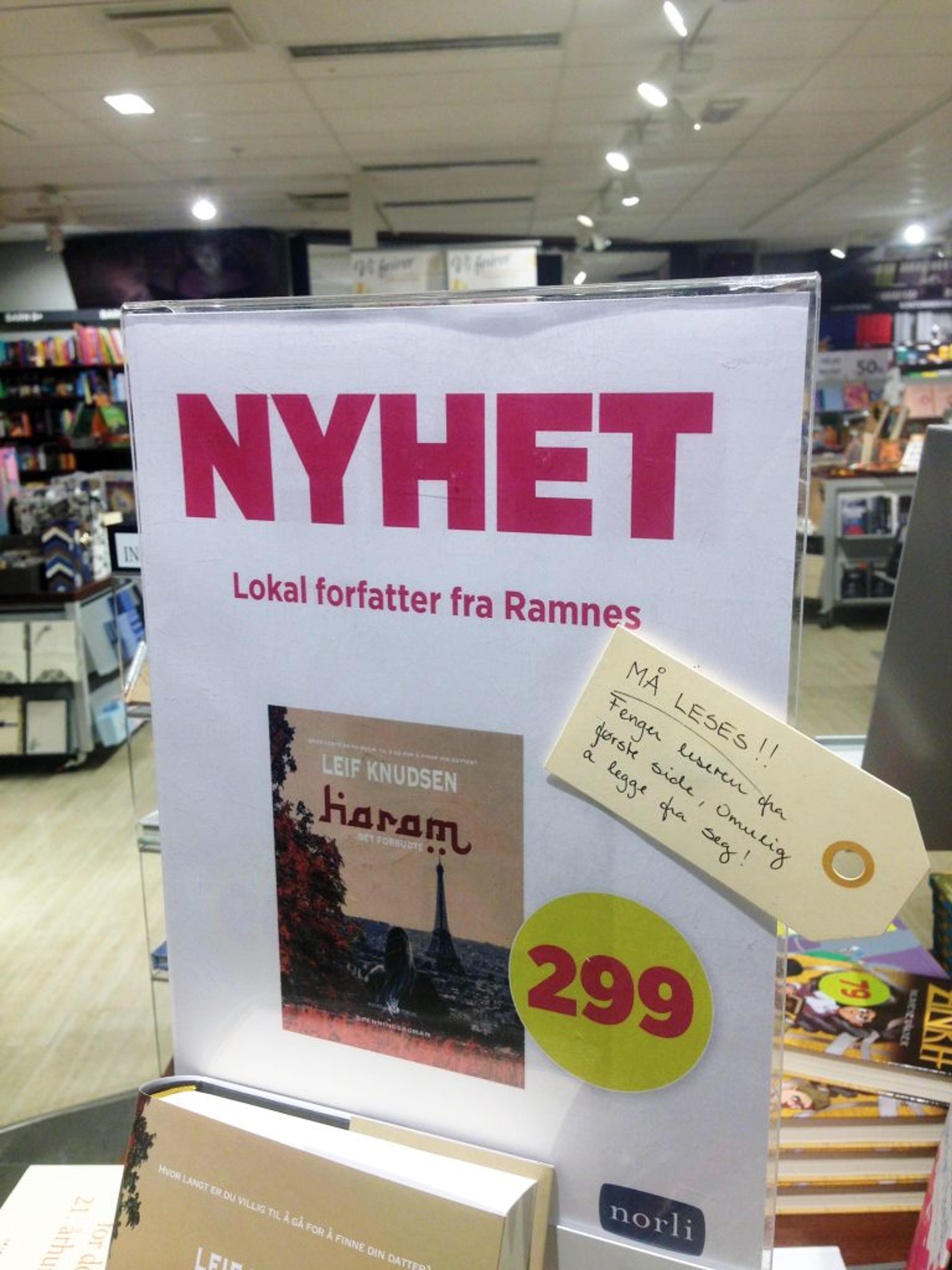 I SALG: Bokhandleren på Re-torvet har boka til den lokale forfatteren utstilt på gromplassen. Foto: Privat.
