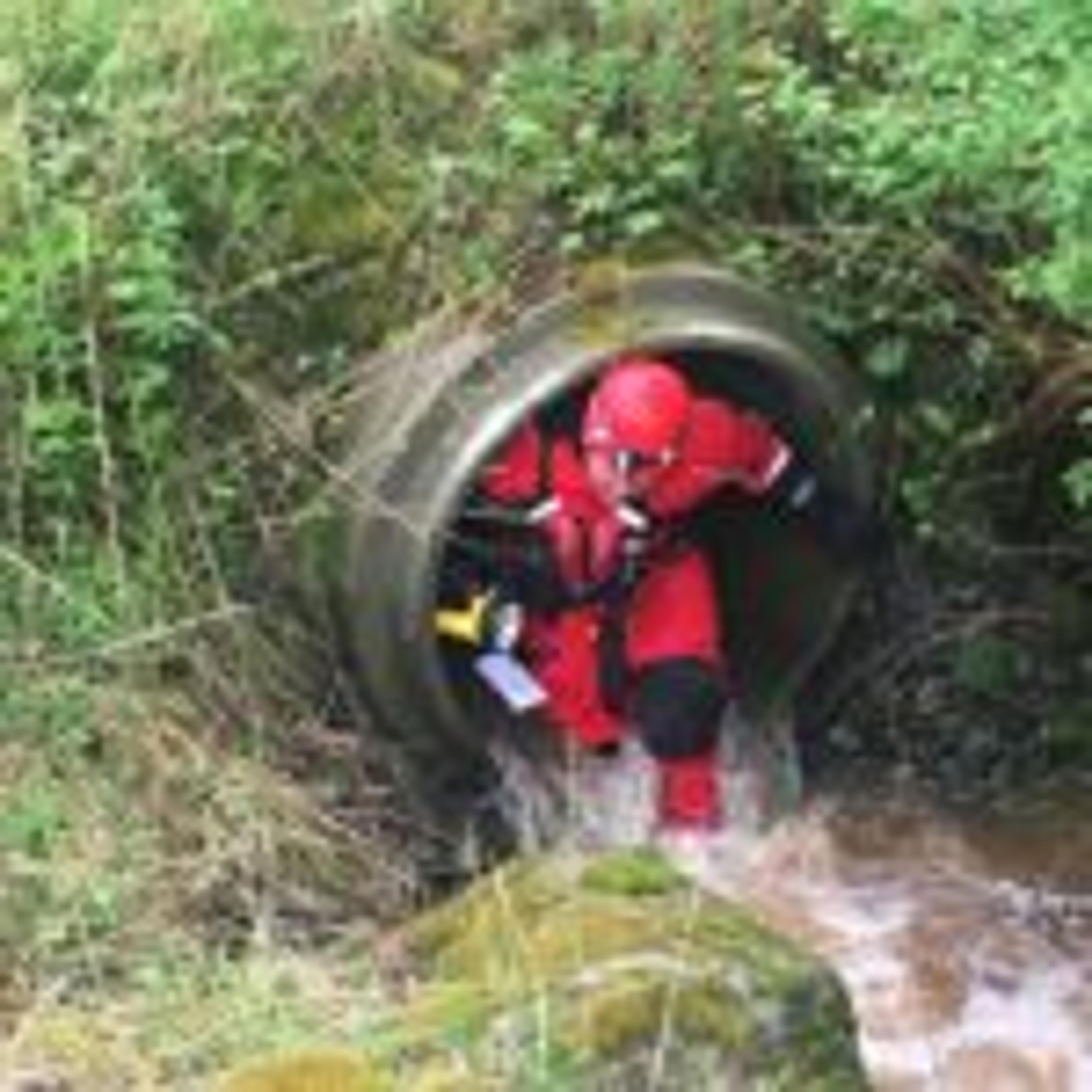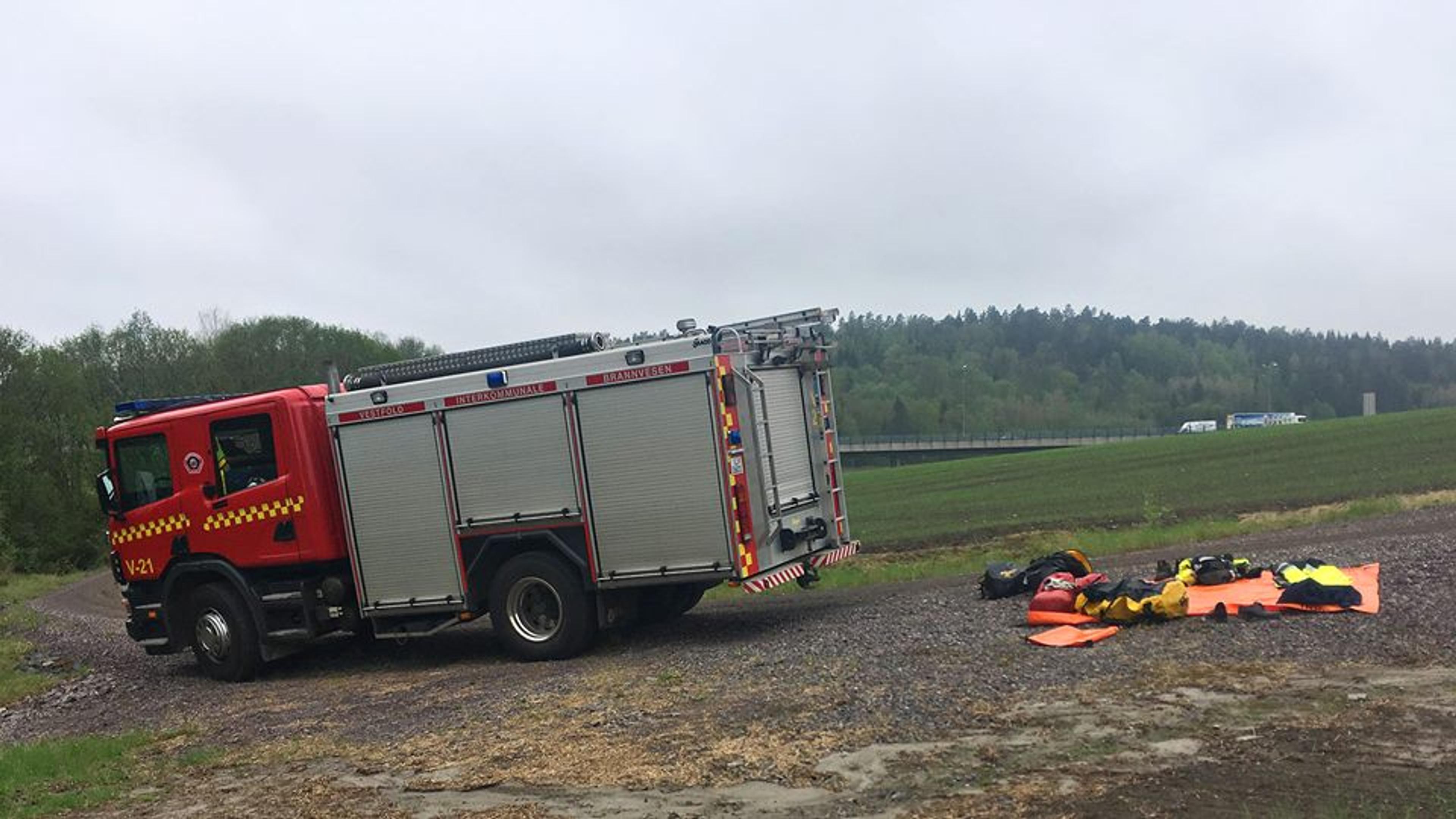 SØK: Fredag formiddag bisto brannmannskaper fra Vestfold Interkommunale Brannvesen med å avsøke dreneringsrør i området ved E18 nær Barkåker – uten funn. Søket er utvidet mot Undrumsåsen. Foto: VIB.