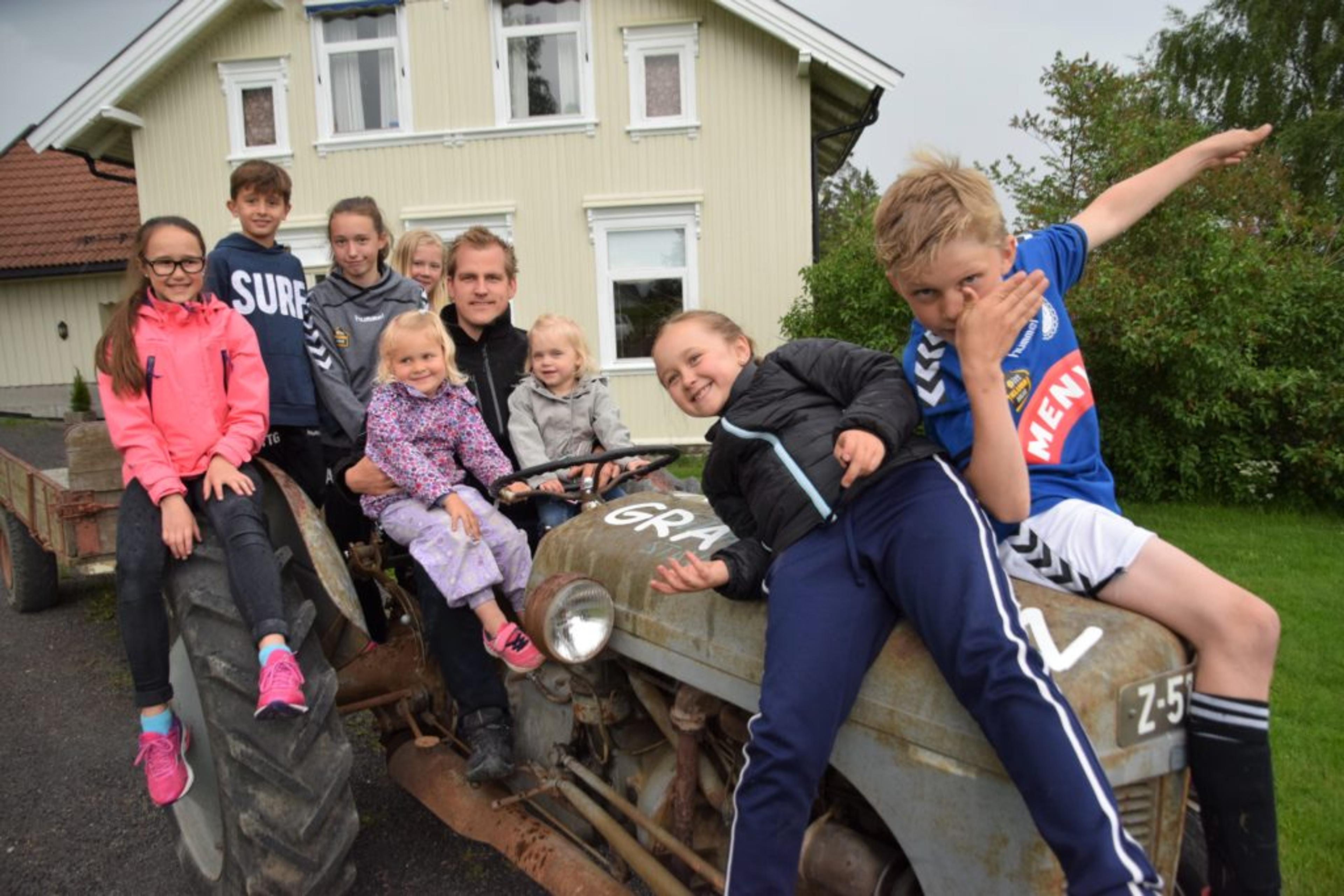 BARNAS DAG: Fra venstre ser vi følgende Hjerpetjønn-unger: Camilla Bakke (12), Tyvan Gran (9), Andrea Gran (12), Linnea Kjær Endrerud (4), Malin Møller Nilsen (11), Robert Klausen (31), Amanda Klausen (2), Julie Andrea bakke (8) og Emil Mørken Skar (9). Det var den eldste ungen på bildet – Robert på 31 år – som kom på ideen, som falt i god jord hos de yngre barna med en gang. – Det blir veldig gøy, sier de. Foto: Stian Ormestad.