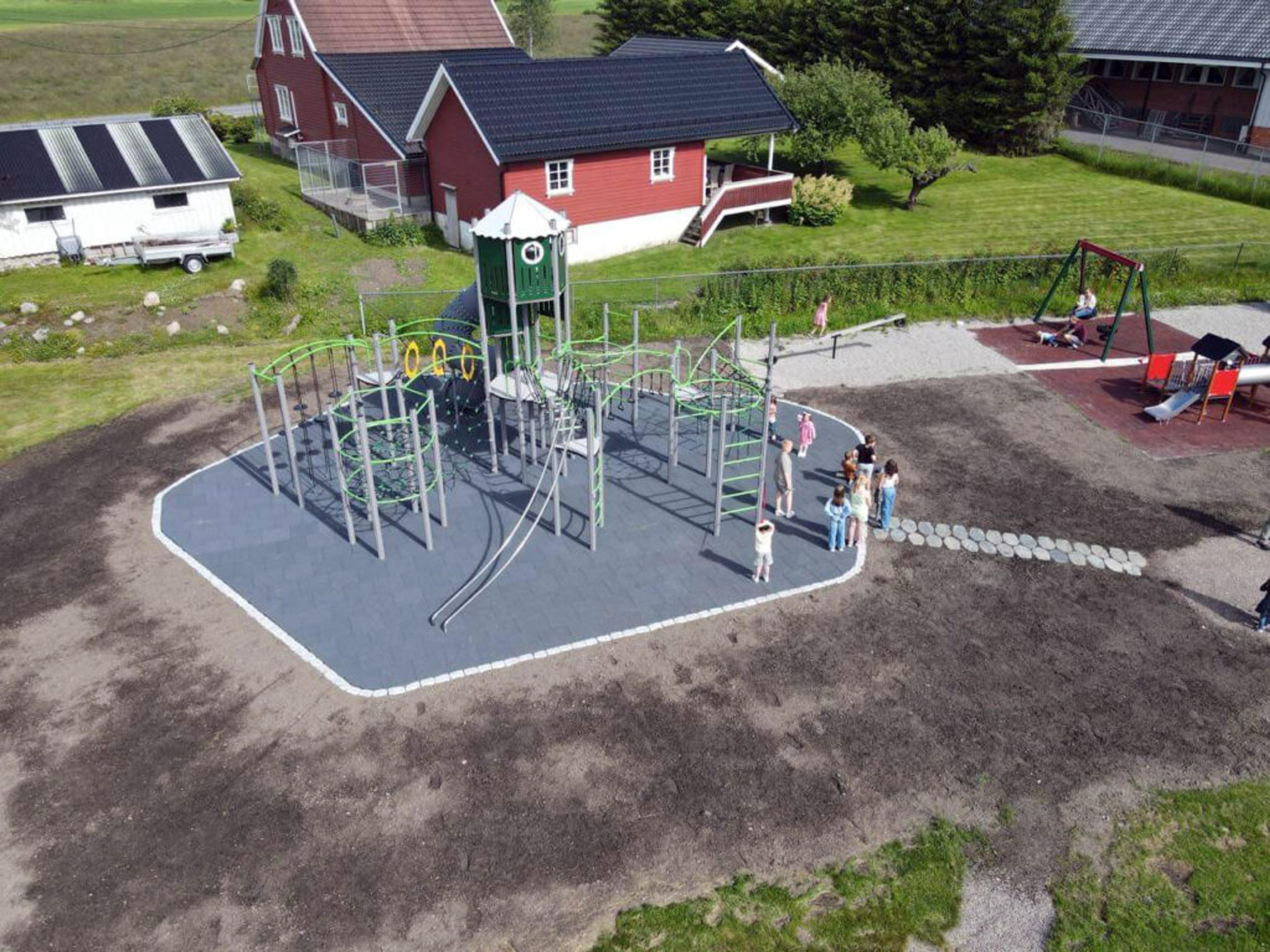 Det imponerende lekeapparatet sto ferdig tidligere i sommer, med stor åpning på sankthansfesten på Sagatun. Det gamle er også beholdt, oppgradert mange hakk.
