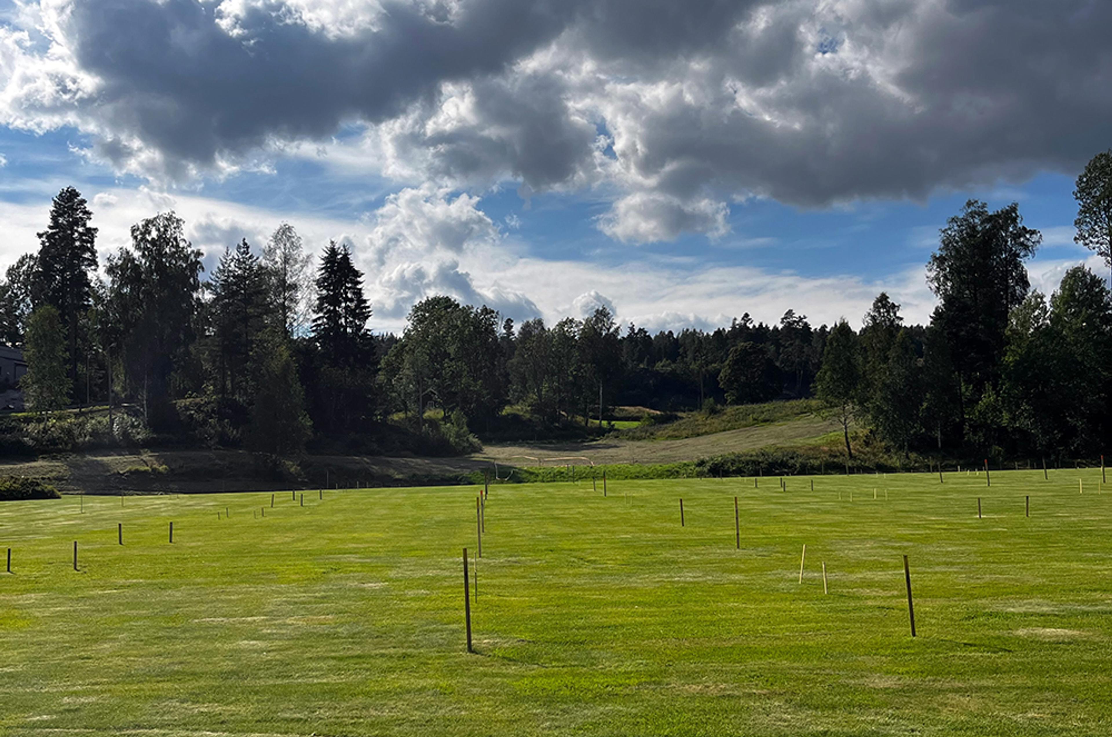 At det snart er marked igjen er de sirlig oppstilte pinnene som nå dekker en større del av fotballbanen et tydelig tegn på. – Dette er oppmålingen til alle bodene, forteller Ann Kristin. Hennes svigerfar Tore Fevang er den som går på kryss og tvers med målebåndet sitt.