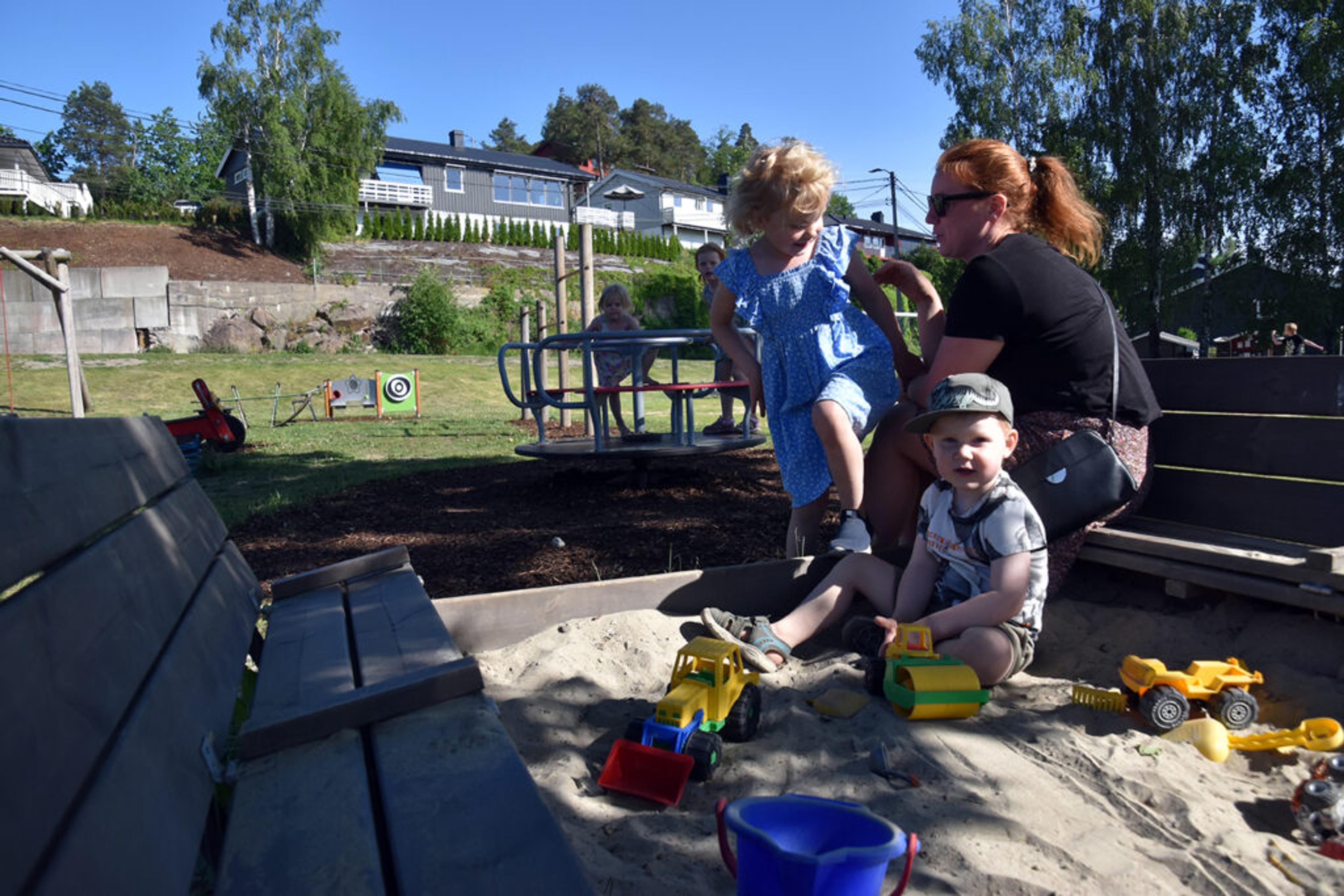 At lekeplassen vil favne over et stort område med mange barn, er det liten tvil om. Jonas (3) ser ut til å være storfornøyd med en oppgradert sandkasse med ny sand.