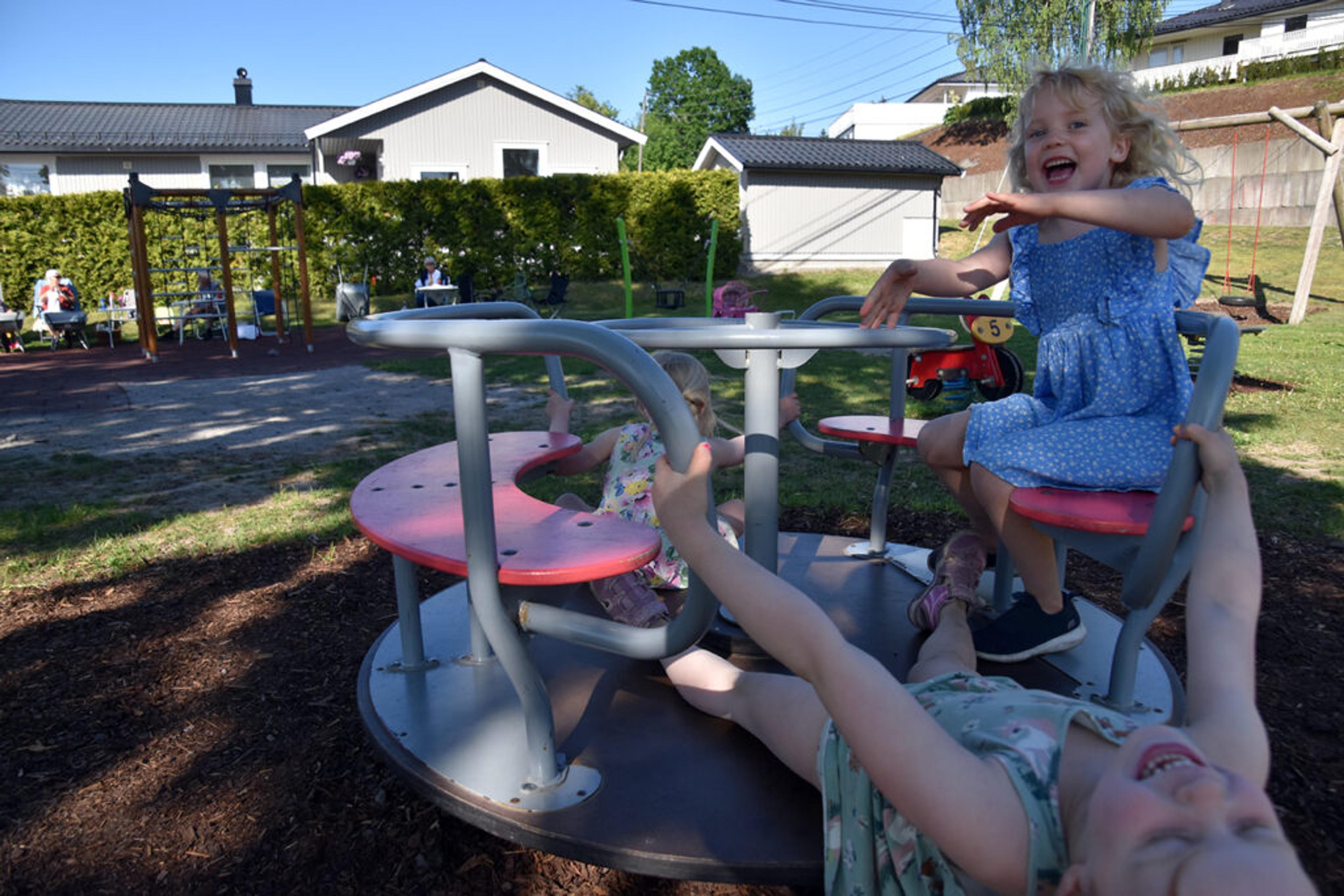 Amalie (5) kan nesten ikke få snurra nok og fort nok på «snurra», jentene flakser rundt i en ellevill fart. Huskene er oppgradert, det er klatrestativ, vippehusker og mye annet moro her.