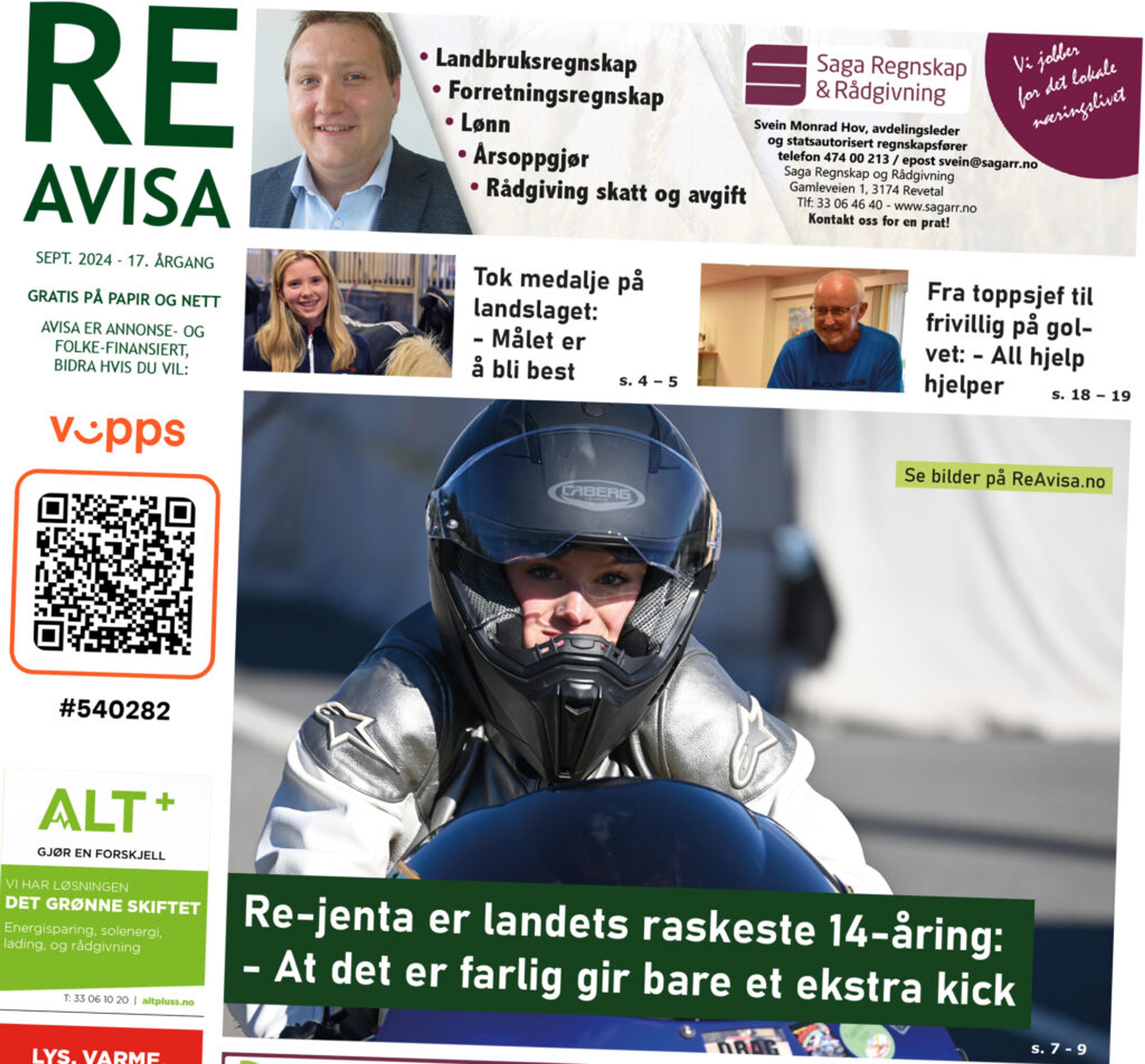 LOKALT LESESTOFF: ReAvisa dekker gamle Re kommune med sogna Våle, Ramnes, Fon, Undrumsdal, Vivestad og bygdebyen Revetal. Ei fersk avis er nå klar for å leses, enten med papiravisa i handa eller her på skjermen. Faksimile: Forsida på ReAvisa september 2024.