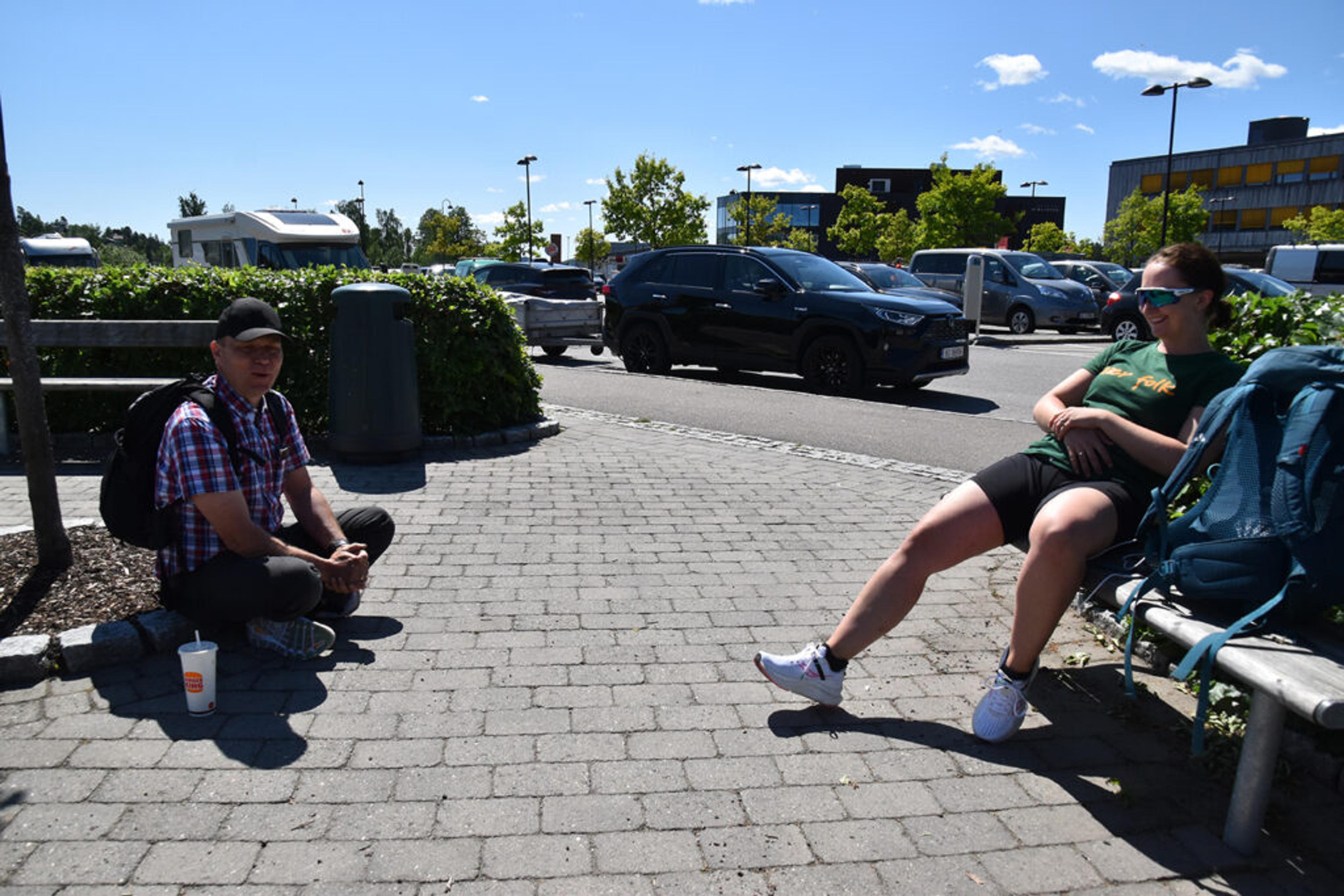 GIKK KOMMUNEN PÅ LANGS: Karoline Lie gikk den nye storkommunen på langs i valgkampen, og fikk med seg Svein Holmøy (begge SP) på deler av turen. Her med en rast på Revetal, cirka halvveis. Foto: Stian Ormestad, ReAvisa.