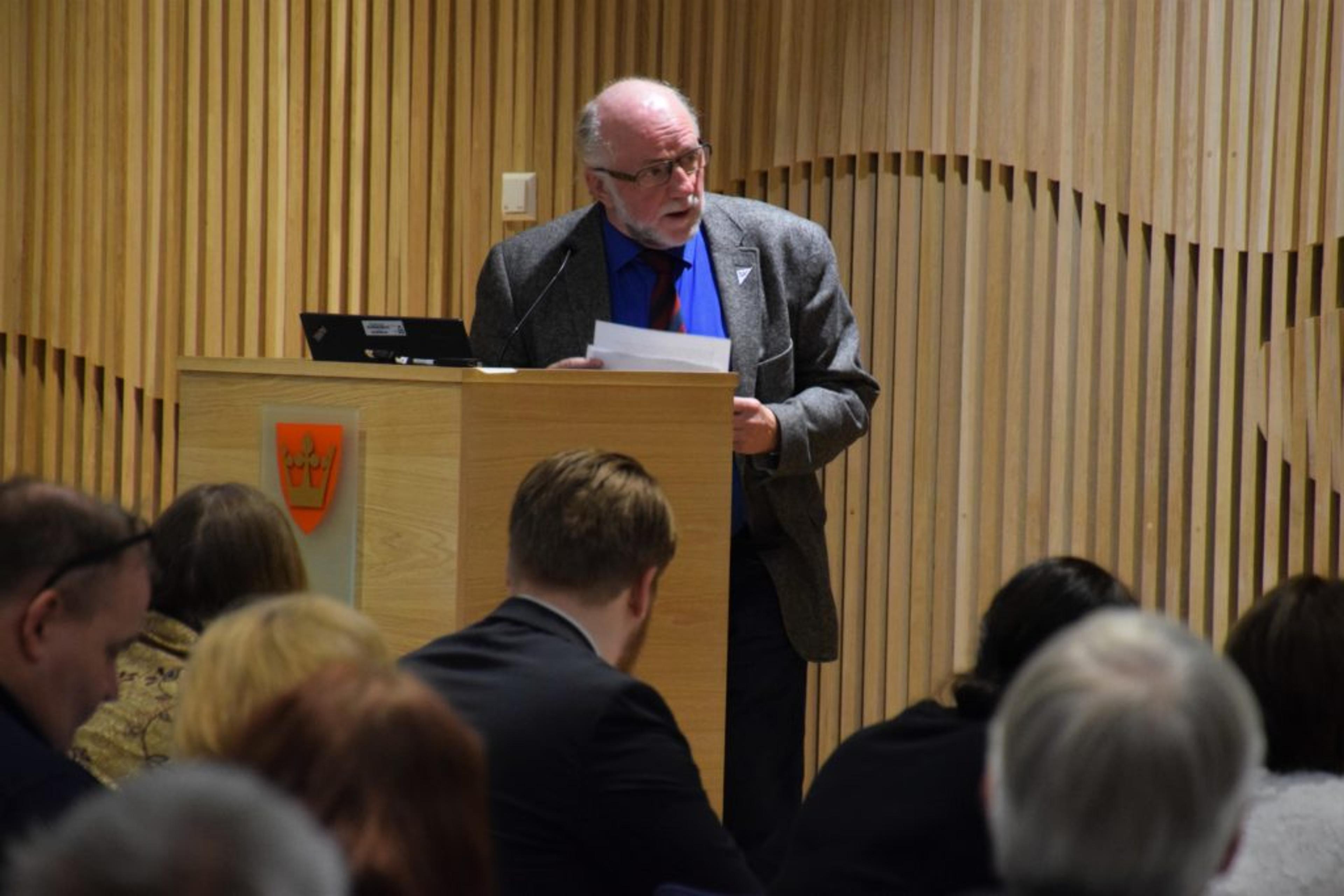 GRUNN TIL BEKYMRING? Heming Olaussen (SV) på talerstolen under det første felles kommunestyremøte for Re og Tønsberg. Foto: Stian Ormestad.