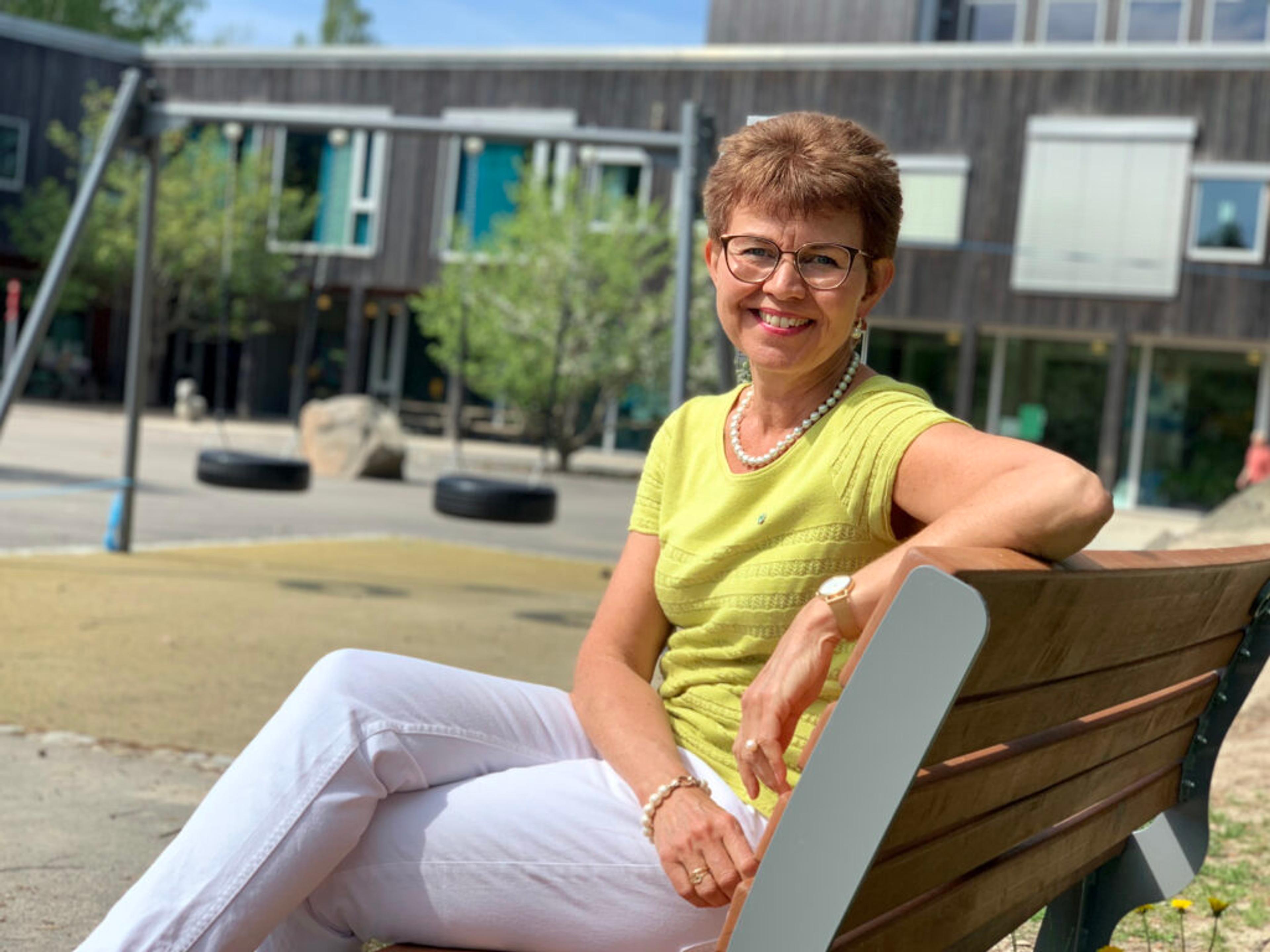 FJERN FIRERKRAVET: Kathrine Kleveland, førstekandidat for Senterpartiet i Vestfold i høstens stortingsvalg, her foran Røråstoppen skole. Foto: Privat.