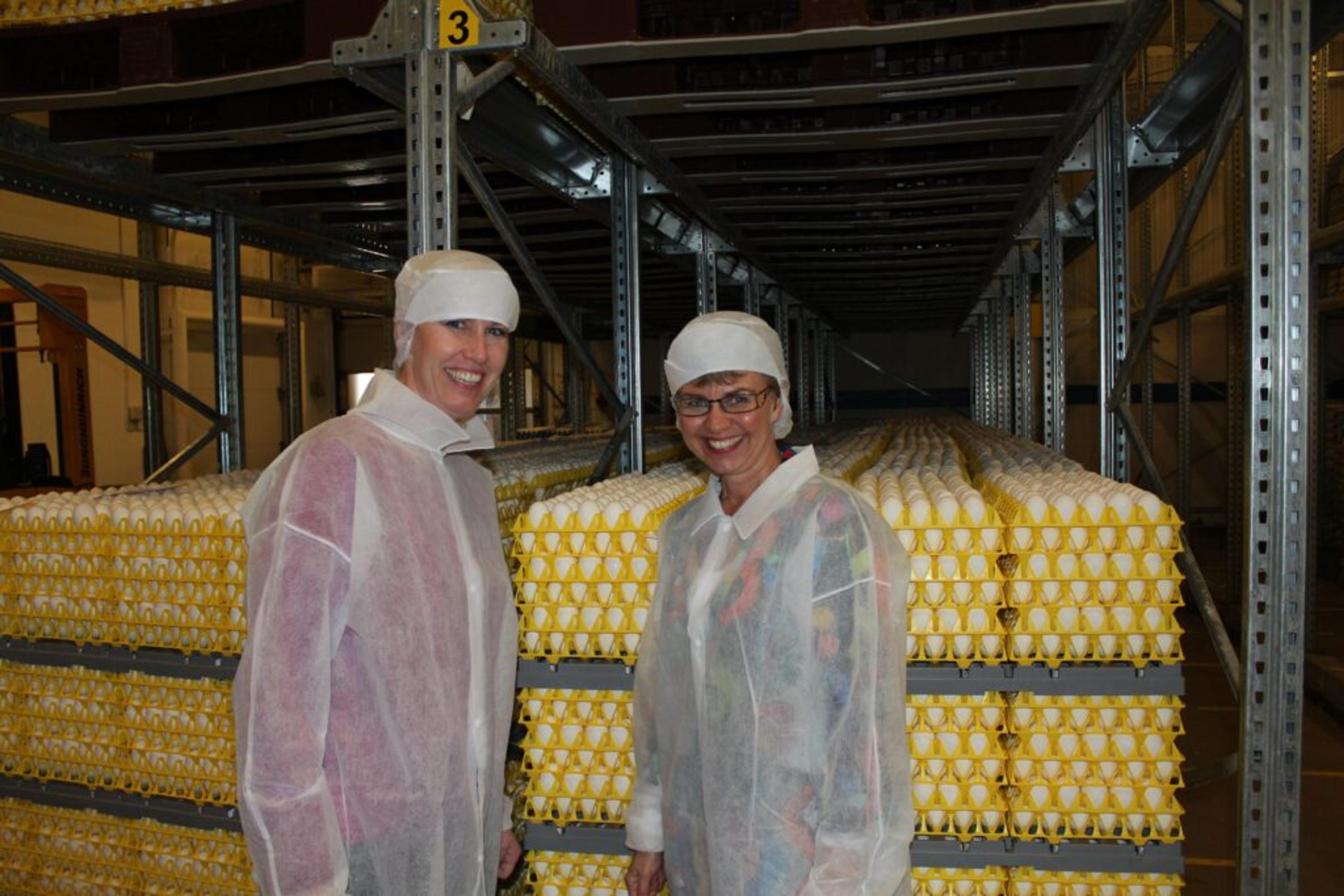 VALGKAMP I RE: Samspillet mellom det offentlige og næringslivet er nøkkelen til å redde norske arbeidsplasser og sørge for fortsatt verdiskaping i hele landet, skriver Kathrine Kleveland (SP), her sammen med NHOs regiondirektør Kristin Saga på Nortura Eggprodukter på Revetal i en tidligere valgkamp. Foto: Privat.