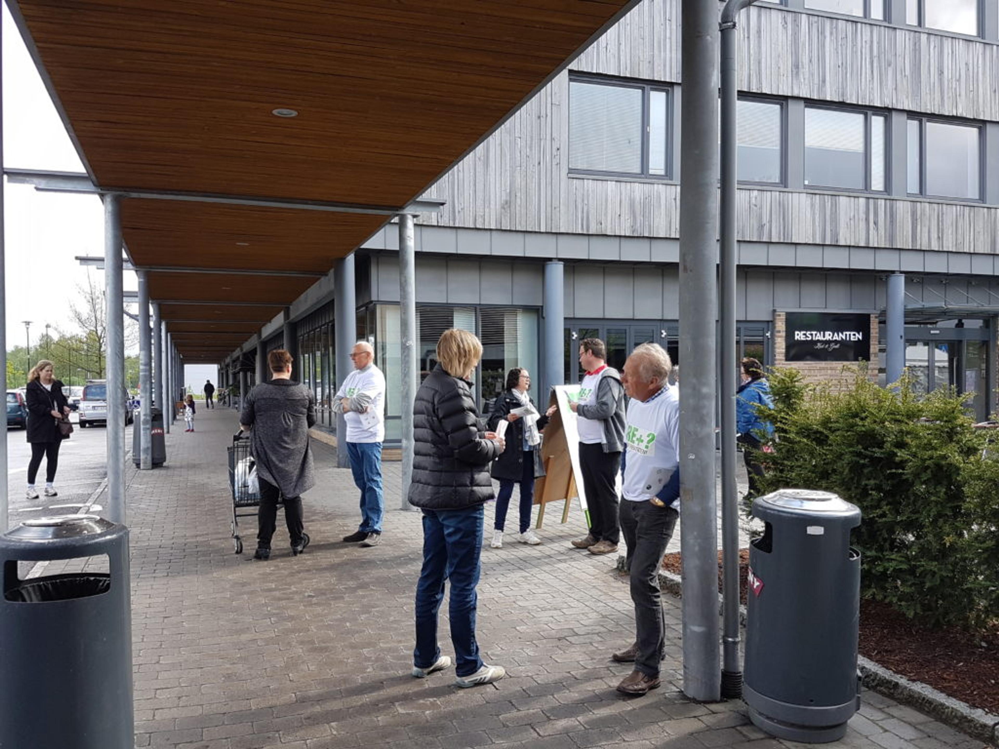 PÅ STAND: Representanter fra så å si alle partiene i kommunestyret i Re kommune, bortsett fra SV og MDG, sto på stand for å promotere en sammenslåing, tross nei i folkeavstemninga året før. Det var lite begeistrelse å spore for en sammenslåing, tross T-skjorter og plakater. Bildet er fra Re-torvet, og året var 2016. Foto: Stian Ormestad, ReAvisa.